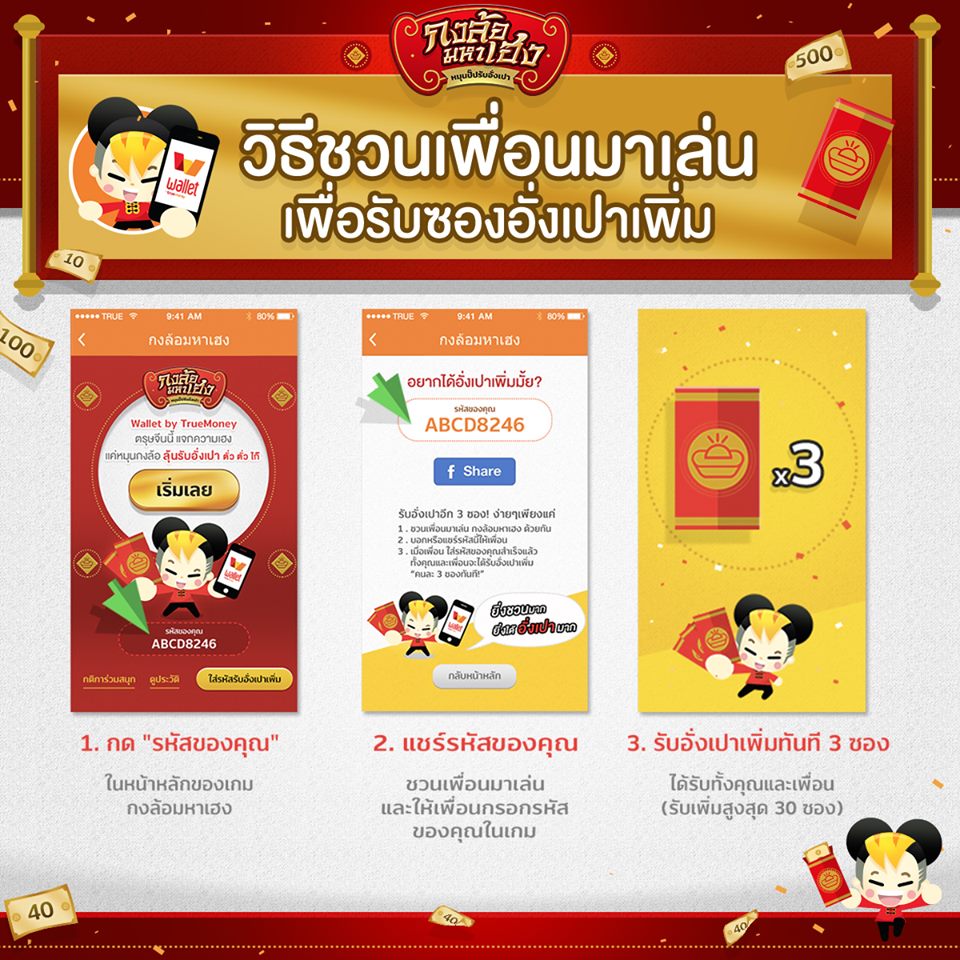 โดยเริ่มต้นนั้นทุกคนจะมีซองอั่งเปาเท่ากันคนละ 3 ซอง โดยสามารถหาซองอั่งเปาเพิ่มได้เพื่อนำมาเล่นต่อจากการแชร์รหัสให้เพื่อนๆ และจะได้เพิ่มอีกคนละ 3 ซอง