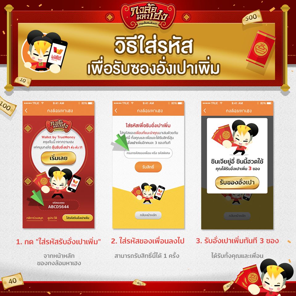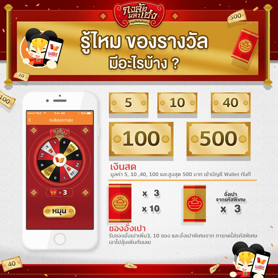ในเมื่อเทศกาลตรุษจีนเข้ามาถึงทุกที ก็เป็นวันที่เด็กหลายๆคนชื่นชอบและรอคอยทุกๆปีเพื่อรอรับซองแดงๆหรืออั่งเปาจากผู้ใหญ่ ซึ่งในปีนี้ Wallet by TrueMoney ก็ได้จัดกิจกรรม กงล้อมหาเฮง ขึ้นมาเพื่อให้ผู้ใช้เสี่ยงดวงลุ้นว่าจะได้หรือไม่แบบฟรีๆไม่มีค่าใช้จ่ายใดๆทังสิ้น รวมมูลค่ารางวัลกว่า 2,000,000 บาท