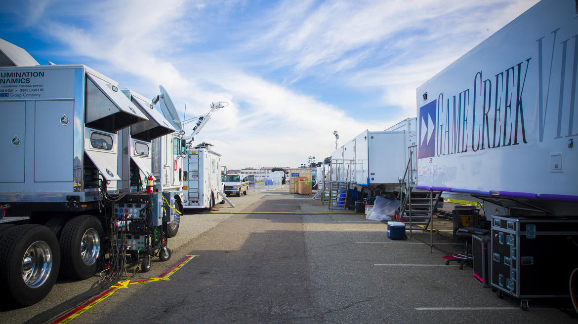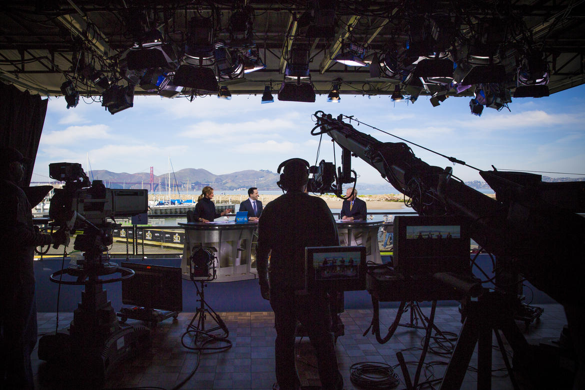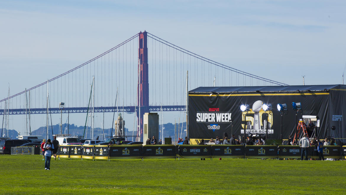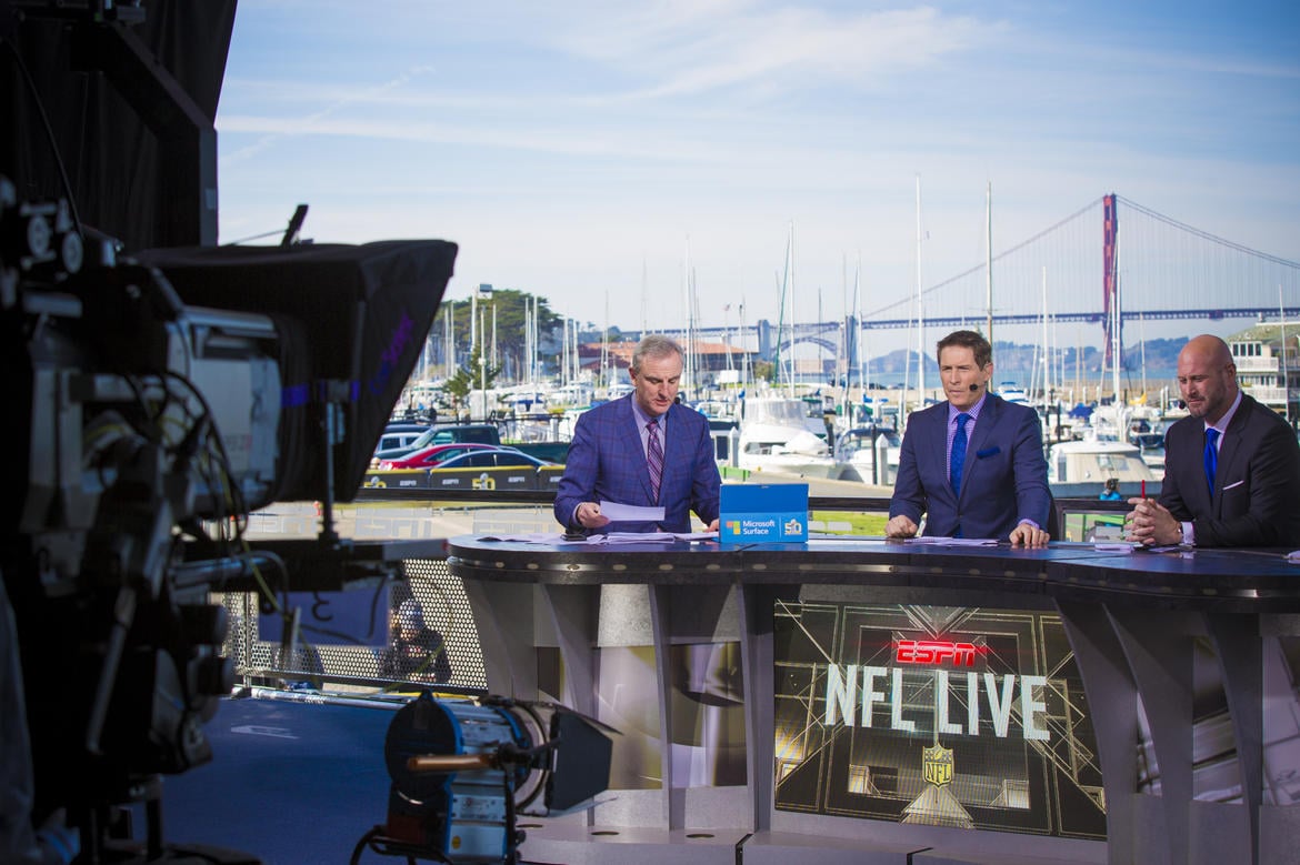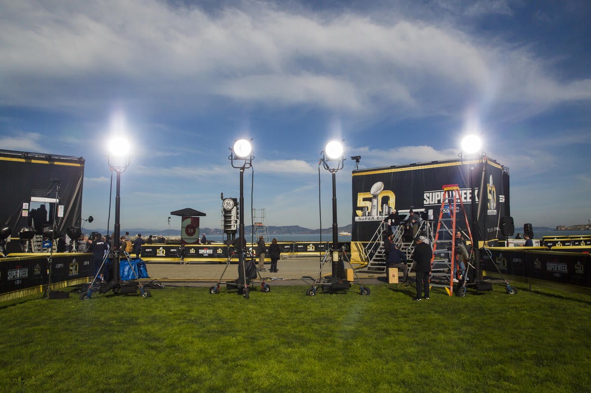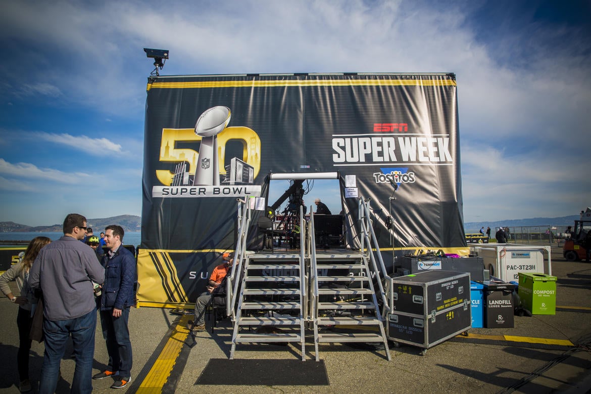 ESPN นั้นใช้เป็นสตูดิโอเคลื่อนที่ 2 สตูดิโอสำหรับรายการสำหรับ Super Bowl โดยเฉพาะ โดยจะตั้งอยู่ที่ Marina Green ในซานฟรานซิสโก ซึ่งจะมีกล้องอยู่ด้านบนเพื่อถ่ายวิวโดยรอบแบบ 360 องศา