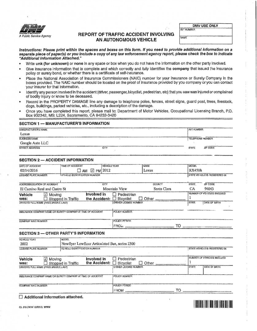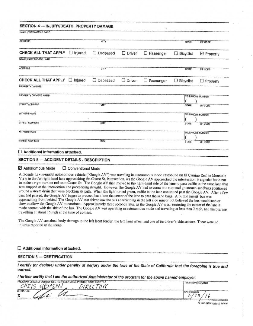 ในครั้งนี้ Google ได้กรอกรายละเอียดรายงานอุบัติเหตุไปยังกรมการขนส่งในรัฐแคลิฟอร์เนีย ยืนยันว่ารถยนต์ไร้คนขับ Lexus รุ่น RX450h ของทาง Google ได้ประสบอุบัติเหตุชนกับรถบัสใน Mountain View การชนนั้นเกิดจากรถยนต์ไร้คนขับต้องการที่จะเปลี่ยนไปเลนกลางเพื่อเลี้ยวขวารอบกระสอบทราย ซึ่งระบบประมวลผลผิดไปว่ารถบัสที่ใกล้เข้ามาข้างหลังในเลนกลางจะชลอหรือหยุดเพื่อให้รถยนต์ไร้คนขับไปได้ก่อน ด้วยเหตุนี้รถยนต์ไร้คนขับจึงเลี้ยวไปชนด้านข้างของรถบัสในความเร็วที่ต่ำ ซึ่งทำให้บังโคลนรถยนต์ข้างหน้า ล้อ และเซนเซอร์ต่างๆได้รับความเสียหาย