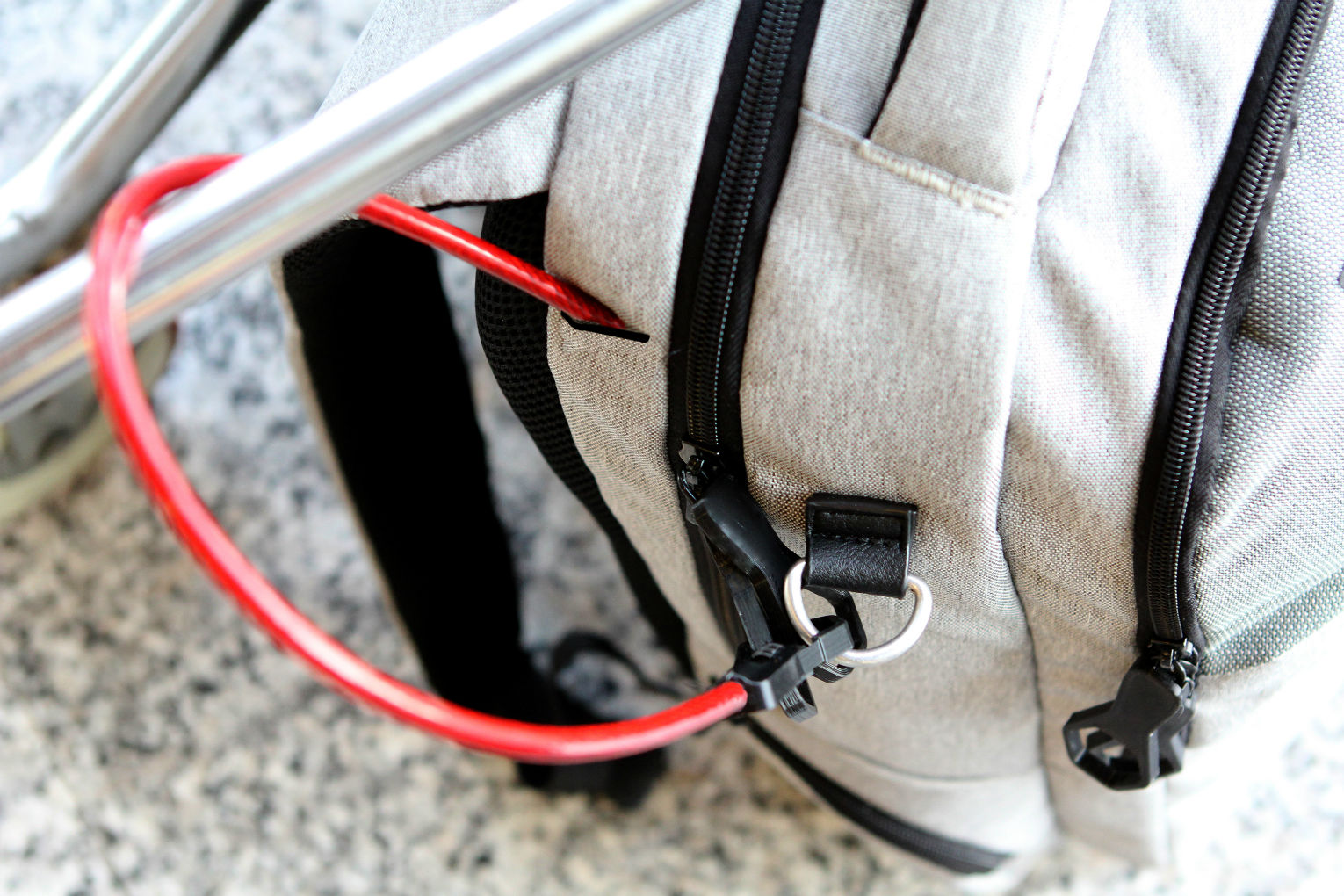 โดยกระเป๋านี้ยังสามารถล็อคไว้กับขาโต็ะหรือในที่ต่างๆได้เหมือนกับการล็อตจักรยานไว้ในที่ต่างๆเพื่อกันการขโมย