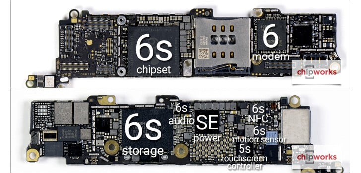 ซึ่งทาง Chipworks ก็ได้ทำการแกะดูฮาร์ดแวร์ภายในของ iPhone SE นี้และเผยแพร่เป็นบทความขึ้นมา โดยที่ iPhone จะใช้ชิปเซ็ต Apple A9 และแรม SK Hynix-made LPDDR4 จำนวน 2GB ซึ่งจะเทียบเท่ากับ iPhone 6s นอกจากนี้ยังรองรับ NFC ชิปเสียง เซ็นเซอร์ตรวจจับการเคลื่อนไหว รวมถึงชิปพื้นที่หน่วยความจำ ก็ยังเป็นรุ่นของ iPhone 6s เช่นกัน