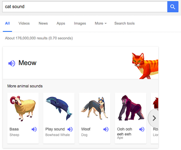 โดยแค่ค้นหาคำว่า cat sound, what sound does a zebra make หรือ animal sounds เพื่อค้นหาเสียงของสัตว์ต่างๆว่าร้องอย่างไร โดยผู้ใช้สามารถฟังเสียงของสัตว์ได้ด้วย ได้โดยตรงจากหน้าผลการค้นหา โดยไม่ว่าจะเป็นบนเดสก์ท้อป หรือ เว็บในมือถือ หรือ ในแอพ ก็สามารถใช้ได้