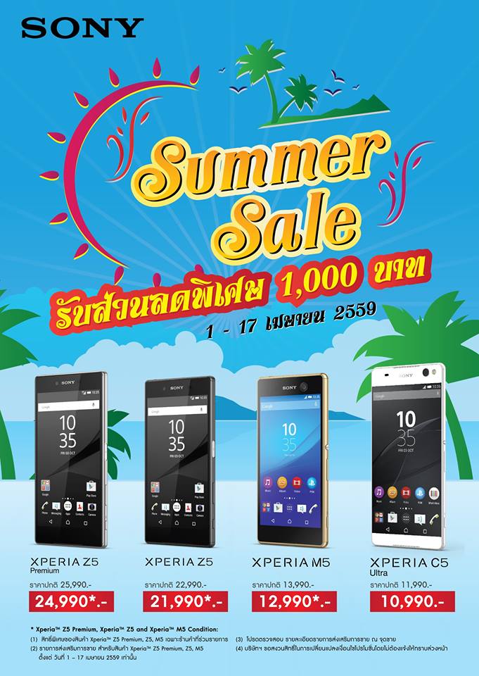 ซึ่งในการจัดโปรโมชั่นของ Sony ในครั้งนี้จะเป็นการลดราคาสินค้า Xperia Z5 Premium, Xperia Z5, Xperia M5 และ Xperia C5 Ultra รุ่นละ 1,000 บาท