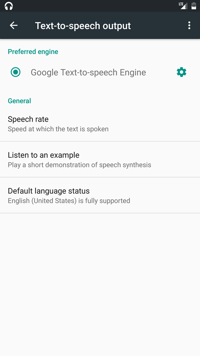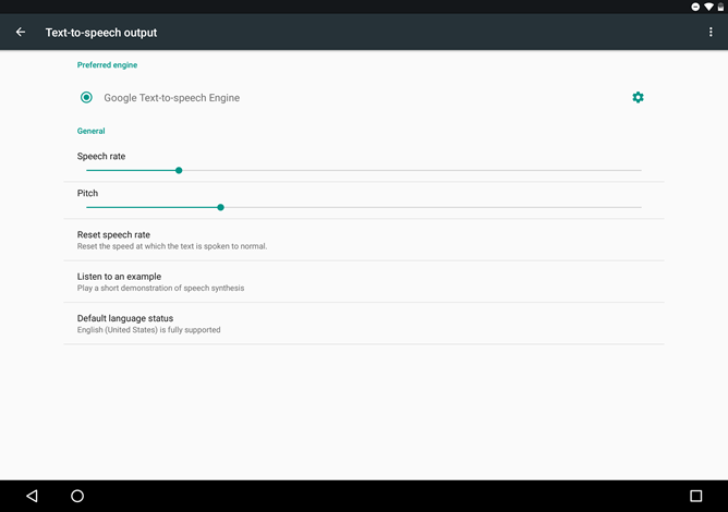 โดยใน Android Marshmallow ในหน้าการตั้งค่าของ Text-to-speech นั้นจะมีให้เลือก Speech rate หรือความเร็วของการพูดได้หรือเลือกภาษาหรือจะเป็นการฟังตัวอย่าง