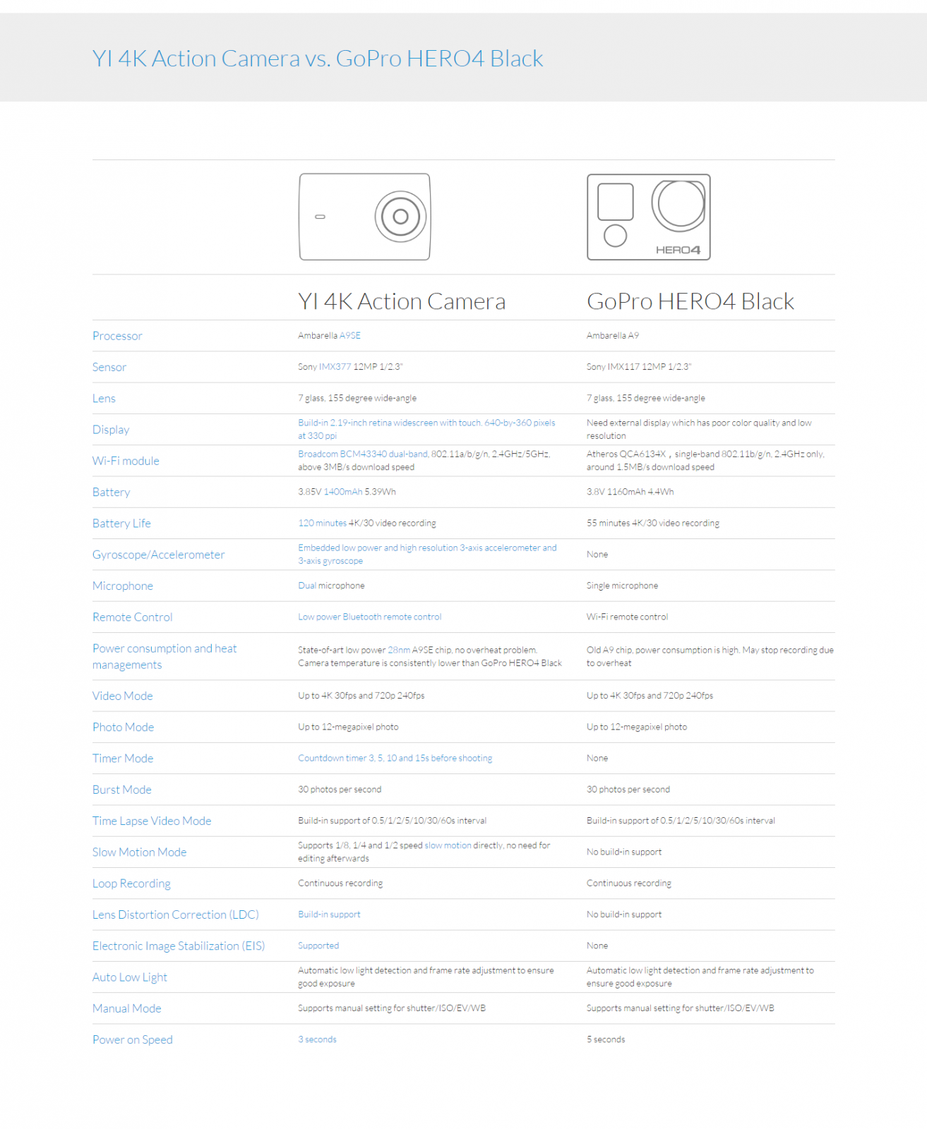 จากการเปรียบเทียบนั้นจะเห็นได้ว่า YI 4K Action Camera ก็มีอะไรหลายๆอย่างที่ให้มามากกว่า GoPro HERO4 Black ซะอีก ตัวอย่างเช่นชิปประมวลผลนั้นใช้ Ambarella A9SE มาพร้อมกับเซนเซอร์ Sony IMX377 12 ล้านพิกเซล และหน้าจอในตัวกล้อง 2.19 นิ้ว ความละเอียด 640×360 พิกเซล นอกจากนี้ยังรองรับ WiFi Dual Band แบตเตอรี่ให้มาถึง 1400mAh อยู่ได้ถึง 120 นาที แกนกันสั่น 3 แกน ไมโครโฟนคู่ และรีโมตบลูทูธที่ใช้พลังงานต่ำ