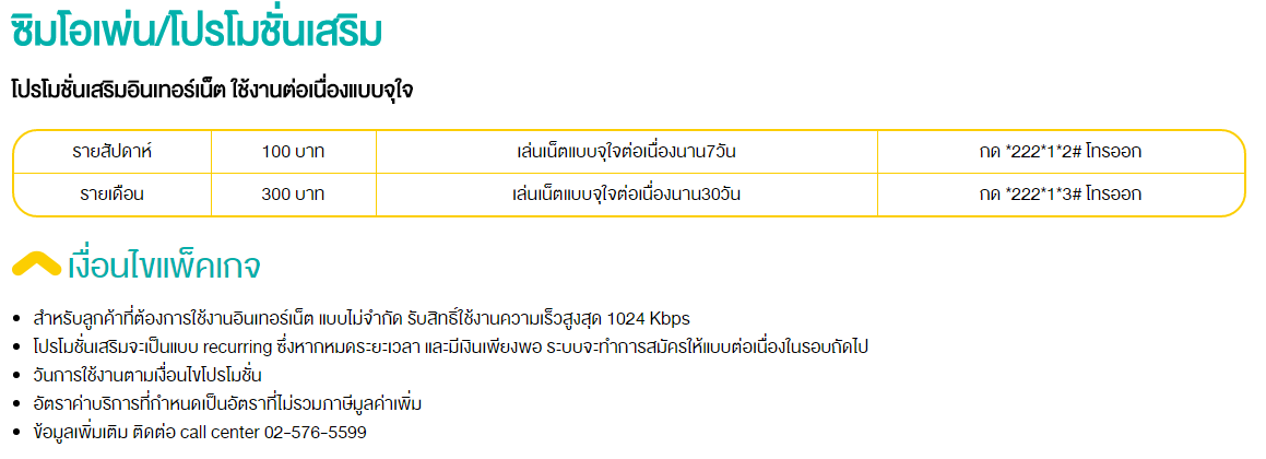 ตามมาด้วยโปรโมชั่นเสริมเล่นเน็ตจุใจเพียง 100 บาทต่อสัปดาห์ หรือ 300 บาทต่อเดือน ด้วยความเร็ว 1 Mbps ตลอดการใช้งาน ซึ่งถ้าหมดรอบใช้งานแล้ว ถ้ามีเงินอยู่ในระบบพอที่จะสมัคร ระบบก็จะทำการสมัครให้อัตโนมัติ