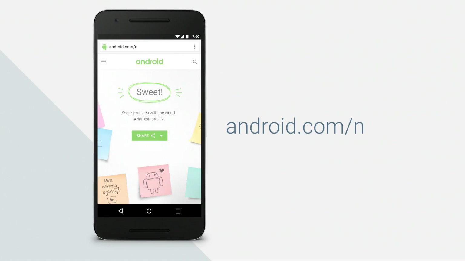 แต่เมื่อถึงเวลางานแล้วนั้นกลับไม่เป็นอย่างที่คาดไว้ ไม่มีการเผยชื่อ Android N ในงาน Google I/O 2016 แต่ในคีย์โน้ตในช่วงของ Android N ได้ออกมาบอกว่า ในปีนี้จะแปลกกว่าปีอื่น เพราะจะเปิดโอกาสให้คนทั่วโลกได้เสนอชื่อที่จะใช้ในชื่อ Android N