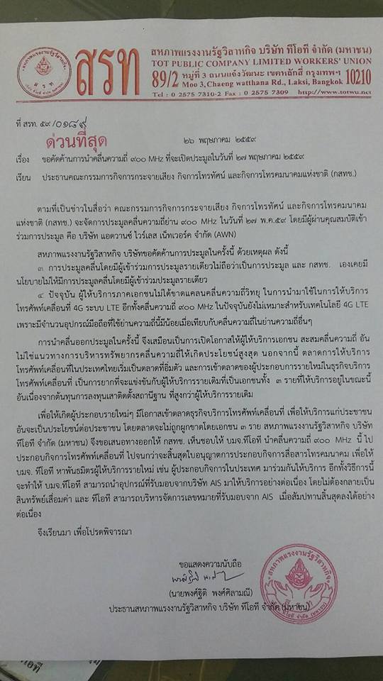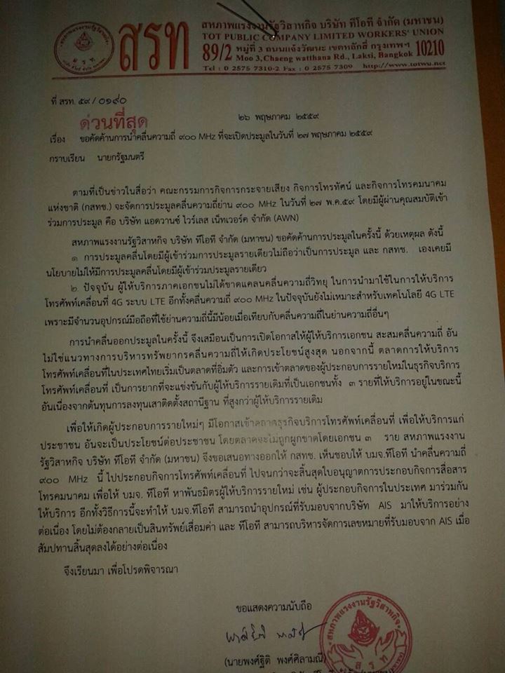 คงเหลือแค่เพียง “เอไอเอส” เพียงค่ายเดียวที่ตอบรับเข้าร่วมประมูลในครั้งนี้ โดยส่งบริษัทลูกอย่างแอดวานซ์ ไวร์เลส เนทเวอร์ค (เอดับบลิวเอ็น) แต่ล่าสุด เมื่อช่วงเช้าที่ผ่านมา สหภาพแรงงานรัฐวิสาหกิจทีโอที ได้ยื่นจดหมายขอคัดค้านการประมูลที่จะจัดขึ้นในวันพรุ่งนี้ ถึงนายกรัฐมนตรี และประธานกสทช. โดยให้เหตุผลว่า