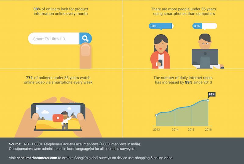 ตามรายงานของ Google Consumer Barometer* ระบุว่า : 53% ของคนไทยใช้อินเทอร์เน็ตทุกวัน , ในขณะที่ 70% ของประชากรในไทยใช้สมาร์ทโฟน และอีก 58% ใช้อินเทอร์เน็ตไปพร้อม ๆ กับการดูทีวี