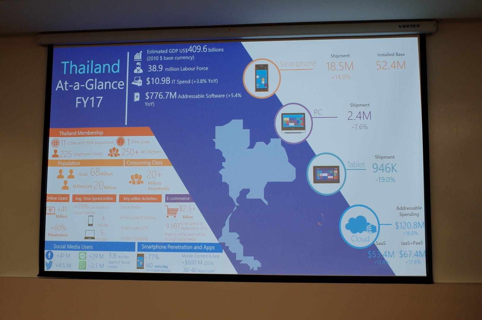 ซึ่งคุณธนพงษ์ อิทธิสกุลชัย ผู้อำนวยการฝ่ายส่งเสริมธุรกิจขนาดกลาง ขนาดเล็ก และพันธมิตร จากไมโครซอฟท์ก็เข้ามาเสริมภาพ SME ด้วยข้อเท็จจริงสำคัญว่า ธุรกิจขนาดกลางและขนาดเล็กของไทยเป็น 40% ของ GDP โดย SME คิดเป็น 99.7% ของธุรกิจในไทย และนับเป็น 80.3% ของอัตราจ้างงานทั้งหมด การพัฒนา SME จึงเป็นการพัฒนาประเทศด้วย ไมโครซอฟท์จึงพัฒนาซอฟต์แวร์ให้เหมาะสมสำหรับการทำงานของธุรกิจขนาดเล็กด้วย สามารถนำ Cloud แบบองค์กรมาให้บริการได้