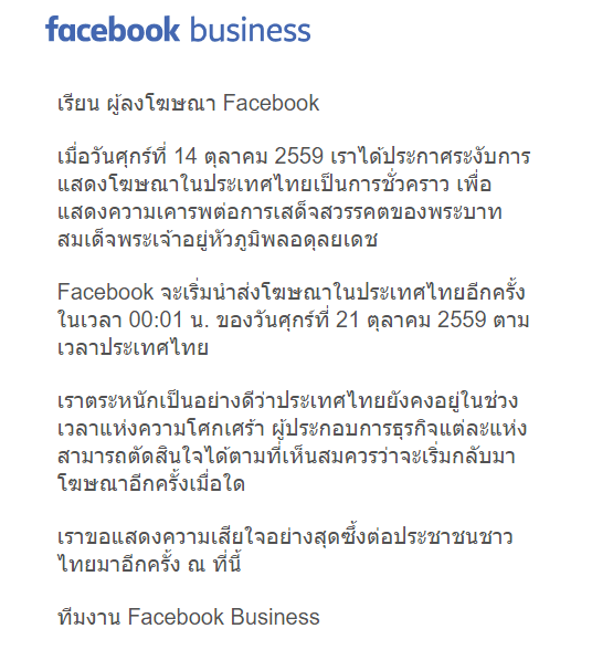 โดยเนื้อความในจดหมายจาก facebook ระบุว่า “เราตระหนักเป็นอย่างดีว่าประเทศไทยยังคงอยู่ในช่วงเวลาแห่งความโศกเศร้า ผู้ประกอบการธุรกิจแต่ละแห่งสามารถตัดสินใจได้ตามที่เห็นสมควรว่าจะเริ่มกลับมาโฆษณาอีกครั้งเมื่อใด”