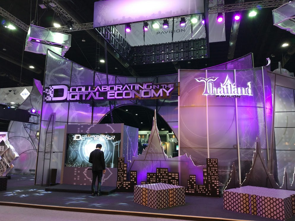 ขณะที่การจัดงานในส่วนนิทรรศการนั้น อยู่ในโซนที่เรียกว่า Thailand Pavilion ภายใต้แนวคิด “ประเทศไทย 4.0” ที่มุ่งปรับเปลี่ยนโครงสร้างเศรษฐกิจและสังคมดิจิทัลประเทศไทยด้วยการใช้เทคโนโลยีเข้ามาช่วย เพื่อสร้างความมั่นคง มั่งคั่ง และยั่งยืนตามหลักปรัชญาเศรษฐกิจพอเพียงของพระบาทสมเด็จพระปรมินทรมหาภูมิพลอดุลยเดช ด้วยการสร้างความร่วมมือกันของทุกภาคส่วน หรือประชารัฐ รวมถึงการสร้างเครือข่ายพันธมิตรทางธุรกิจซึ่งจะเป็นเวทีที่ผู้ประกอบการสตาร์ทอัพจะได้พบปะร่วมกัน และแสดงศักยภาพในเวทีแห่งนี้