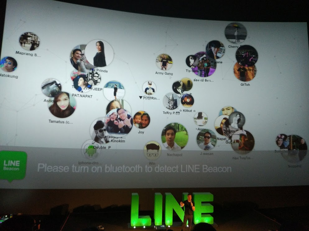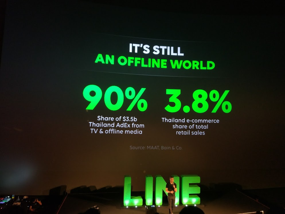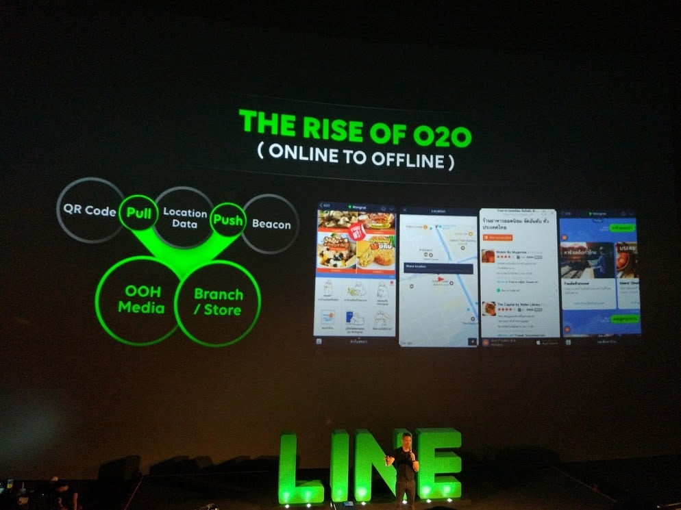 เรียกได้ว่าปัจจุบันการซื้อขายสินค้าผ่านช่องทาง E-commerce ในประเทศไทยยังคงมีสัดส่วนที่ไม่โตมากเพียง 3.8% ของมูลค่าการค้าปลีกทั้งหมด LINE จึงอยากเชื่อมบริการบนโลก Offline เข้ากับโลก Online ให้กับคุณซึ่งเป็นบริการในรูปแบบ O2O (Offline to Online) โดยมีการนำเสนอ Beacon ที่จะช่วยให้ลูกค้าที่เดินเข้ามาในบริเวณร้านของเราสามารถรับ Promotion หรือรับแจ้งกิจกรรมต่าง ๆ เข้าไปใน LINE ได้โดยผ่าน Bluetooth ซึ่งเขาก็ได้ทดสอบให้ดูโดยการแสดงหน้าจอผู้เข้าร่วมในงาน รวมไปถึงตรวจสอบคนที่เข้าไปถ่ายรูปหรืออยู่ใกล้กับเหล่า Mascot ได้อีกด้วย