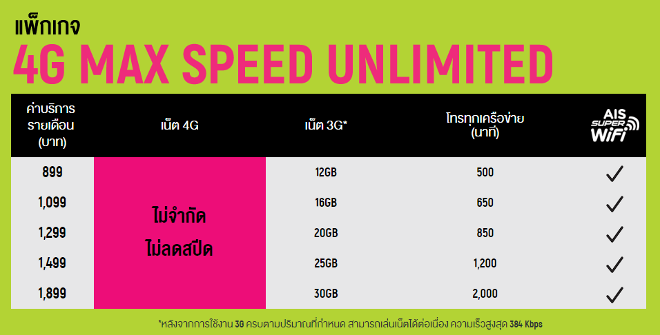 แพ็กเกจ 4G Max Speed Unlimited ของ AIS นั้นจะแตกต่างจากแพ็กเกจของค่ายอื่นๆ สักหน่อยนะครับ คือการใช้งานที่ไม่จำกัดปริมาณข้อมูล และไม่ลดความเร็วนั้นจะใช้ได้กับเน็ต 4G เท่านั้น ถ้าอยู่ในพื้นที่ที่จับสัญญาณได้แค่ 3G ก็จะใช้งานได้ปริมาณเท่ากับที่ระบุในแพ็กเกจคือ
