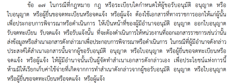 ประกาศฉบับนี้มีคำสั่งที่น่าสนใจในข้อ 17 คือระบุให้เจ้าหน้าที่ต้องหาข้อมูลหรือสำเนาเอกสารจากหน่วยงานที่ออกเอกสารนั้นมาเพื่อดำเนินการ แทนที่จะเป็นหน้าที่ของผู้ติดต่อต้องเตรียมเอกสารไปเอง และห้ามไม่ให้เรียกเก็บค่าใช้จ่ายจากการทำสำเนาด้วย ซึ่งก็น่าจะทำให้การติดต่อรัฐง่ายขึ้น