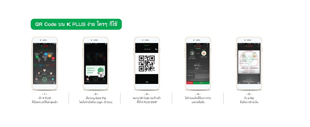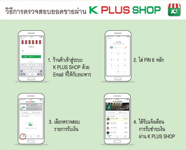 - ลูกค้าสามารถสมัครใช้บริการ K PLUS SHOP ได้ง่ายด้วยตัวเองผ่านแอปฯ K PLUS ได้ทันที ขั้นตอนคือ ล็อกอินเข้าระบบ K PLUS แล้วกดเมนู K+App ซึ่งจะปรากฏในหน้าแรก ดำเนินการตามขั้นตอนการลงทะเบียนบนระบบ K PLUS จนกระทั้งระบบนำไปสู่การดาวน์โหลดแอปฯ K PLUS SHOP จึงล็อกอินเข้าแอปฯ K PLUS SHOP สร้างโปรไฟล์ร้านค้า และเข้าสู่ขั้นตอนการสร้าง QR ของฉัน ก็เสร็จสมบูรณ์ สามารถนำคิวอาร์โค้ดที่ได้ไปใช้งานได้ทันที สามารถดูรายละเอียด K PLUS SHOP เพิ่มเติมได้ที่ www.kasikornbank.com หรือสอบถามข้อมูลเพิ่มเติมได้ที่ โทร. K-Biz Contact Center 02-8888822