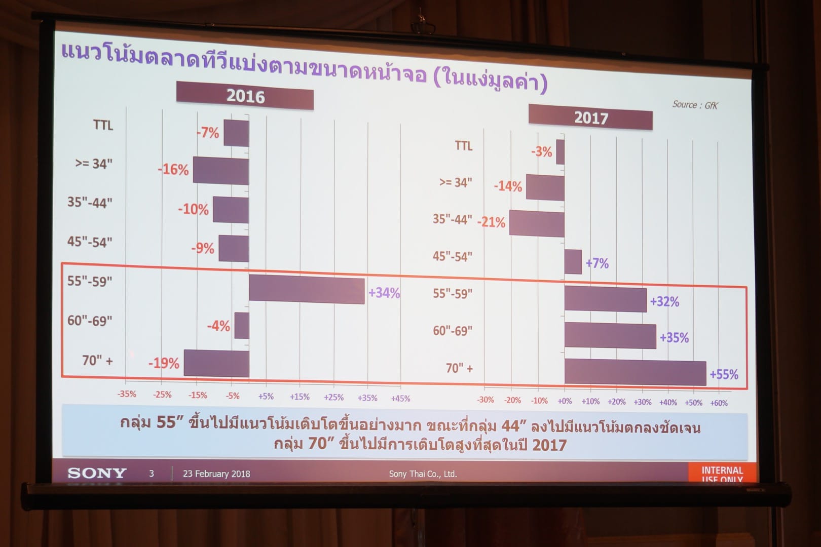 ที่ผ่านมาแนวโน้มตลาดในกลุ่มจอใหญ่นั้นเติบโตมากมาตลอด โดยเฉพาะกลุ่ม 55 นิ้วขึ้นไปนั้นเติบโตมาก ซึ่งสวนทางกับกลุ่มจอขนาด 44 นิ้วลงไปที่เติบโตลดลง นอกจากนี้ตลาดทีวี OLED แม้จะยังมีมูลค่าตลาดไม่สูงนัก แต่ก็เดิบโตมากขึ้นตลอด ตอนนี้มูลค่าตลาดอยู่ที่ 283 ล้านบาทแล้ว ในปี 2017 โตขึ้นกว่า 2016 ถึง 66% โซนี่จึงเปิดตัว Bravia 77A1 เพื่อตอบโจทย์ตลาดนี้