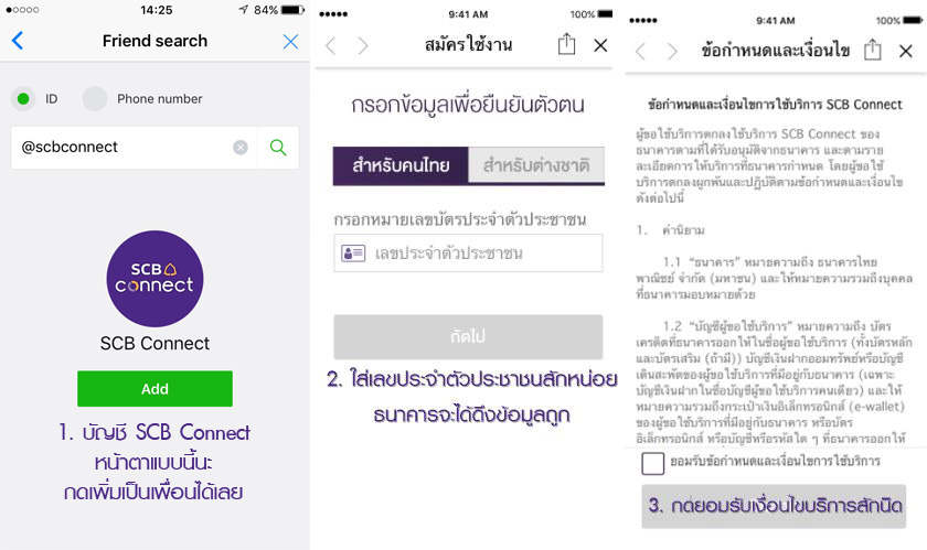 วิธีการใช้ SCB Connect ก็ง่ายมากครับ ทำไม่ถึงนาทีก็เสร็จ เริ่มต้นจากเพิ่มบัญชี SCB Connect เป็นเพื่อนก่อนโดยค้นหา @scbconnect ในไลน์ หรือสแกน QR Code ด้านบน หรือกดปุ่ม Add Friend ด้านบนนี้เลยก็ได้ครับ