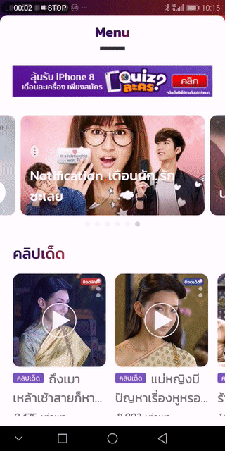 ตัวเมนูหลักนั้นดีไซน์ให้ลากจากด้านบนลงล่าง ก็เป็นดีไซน์ที่สร้างความแปลกใหม่ และเพิ่มประสบการณ์ใช้งานใหม่ๆ ให้กับ User ซึ่งหน้าเมนูนี้จะกดเลือกหมวดของรายการที่จะรับชมได้ เช่น ซีรีส์ไทย, ซีรีส์นานาชาติ รวมถึงข่าวสารอัปเดทต่างๆ ครับ ที่สำคัญปุ่มค้นหาก็จะรวมอยู่ในหน้านี้ด้วย ซึ่งก็เป็นปุ่มที่ใช้งานง่ายกว่าแอปอื่นๆ เพราะมีคำค้นยอดนิยมมาแสดงให้เลือกค้นได้เลยโดยไม่ต้องพิมพ์เอง