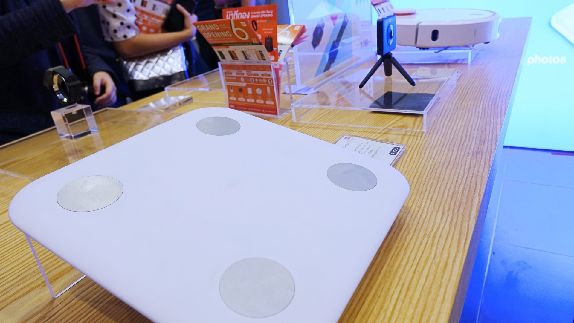 ด้านข้างจะเป็นโต๊ะโชว์สินค้า นอกจากมี Smart Watch ให้ทดลองใส่ ทดลองเล่นแล้ว ยังมี Mi Body Composition Scale (เครื่องชั่งน้ำหนักดิจิทัล), Mi Sphere Camera kit (กล้อง 360 องศา), Mi Robot Vacuum (หุ่นยนต์ดูดฝุ่นอัจฉริยะ), MiJia Wiha 24 in 1 Screwdriver Set (เซ็ทไขควง) เรียกได้ว่าครบครันเลยทีเดียว