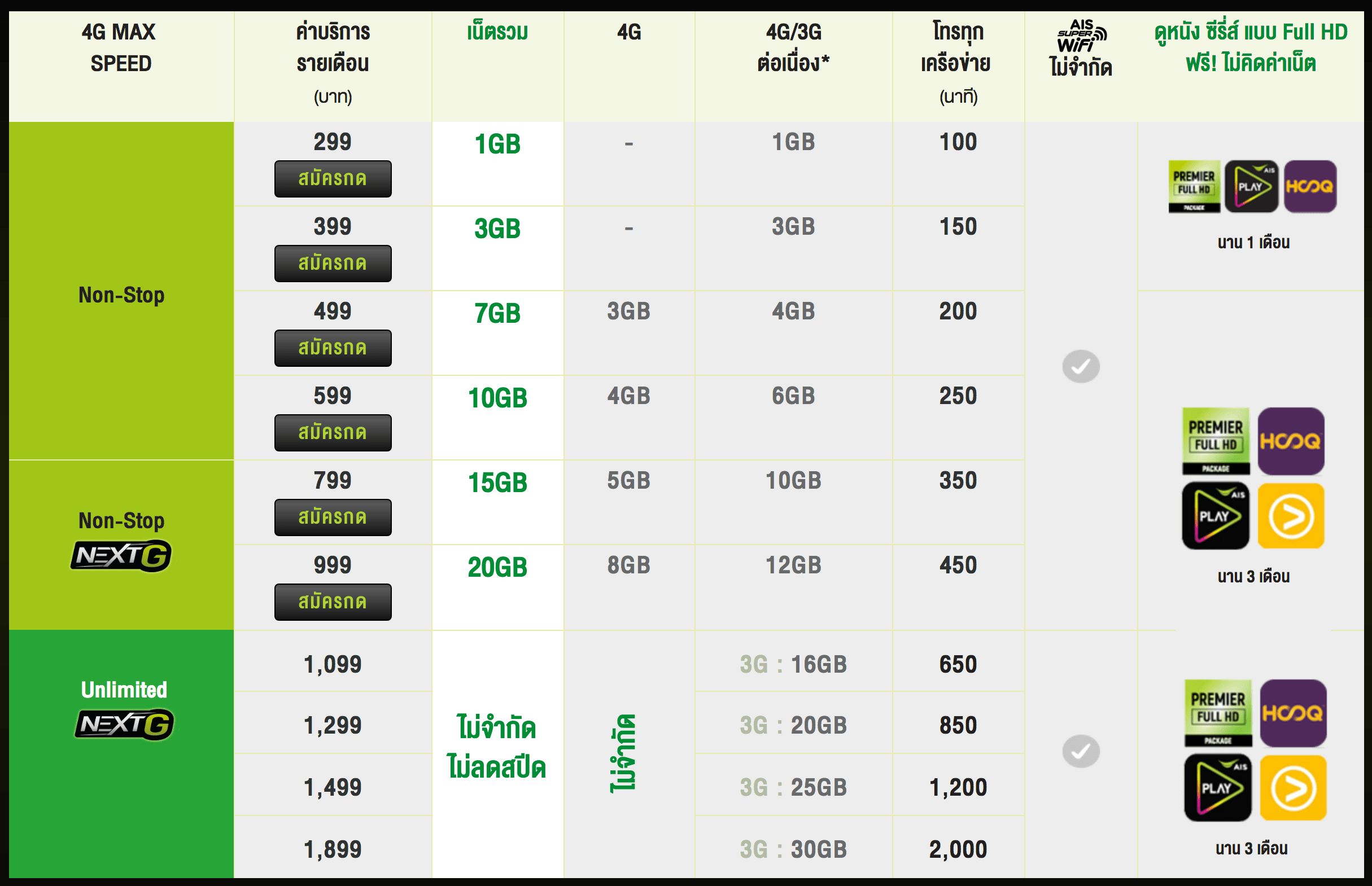 สำหรับผู้ต้องการใช้ AIS Next G ก็ต้องมีแพ็กเกจที่เหมาะสมด้วย โดยแพ็กเกจที่ใช้ Next G ได้คือ 4G Max Speed ราคา 799 บาทขึ้นไป ซึ่งอัตราข้อมูลที่จะนำไปคิดในแพ็กเกจนั้นจะคิดเฉพาะข้อมูลที่วิ่งผ่านเครือข่ายมือถือเท่านั้นครับ ซึ่งปกติ Next G จะใช้ข้อมูลจากเครือข่ายมือถือและ Super Wifi พร้อมกัน ก็หมายความว่าข้อมูลในส่วนที่วิ่งผ่าน Wifi เข้ามาจะไม่ถูกคิดเป็นอัตราการใช้งาน ส่วนถ้าใช้แพ็กเกจราคา 1099 ต่อเดือนขึ้นไปก็ไม่ต้องคิดเรื่องการใช้ข้อมูลให้ปวดหัวแล้ว เพราะสามารถใช้ 4G ได้ไม่จำกัด