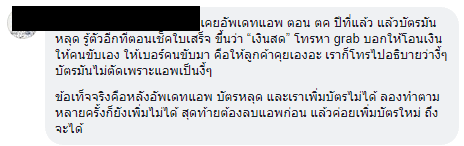 ปริศนากรณีลูกค้าหลายรายถูก Grab แบนเริ่มคลี่คลาย เมื่อแอป Grab มีการเปลี่ยนระบบหรือเปลี่ยนนโยบายหรือด้วยเหตุผลกลใดก็ไม่ทราบ ทำให้ตัวแอปไม่จำหมายเลขบัตรเครดิตที่เคยใส่ (อาจจะเปลี่ยนเครื่องแล้วไม่จำติดไปด้วย หรืออัปเดทเวอร์ชั่นแอปแล้วเลขบัตรเครดิตหายไปก็ไม่ทราบได้) ทำให้ลูกค้าจำนวนมากที่ใช้จ่ายผ่านบัตรเครดิตเป็นประจำ เมื่อใช้บริการ Grab เสร็จแล้วก็ไม่ได้จ่ายเงินสดให้ผู้ขับ เพราะคิดว่าบริษัทจะไปตัดกับบัตรเครดิตเหมือนอย่างเคย แต่เมื่อผู้ขับไม่ได้เงินจึงไปร้องเรียนกับ Grab ทำให้มีการระงับบัญชีกันเกิดขึ้น