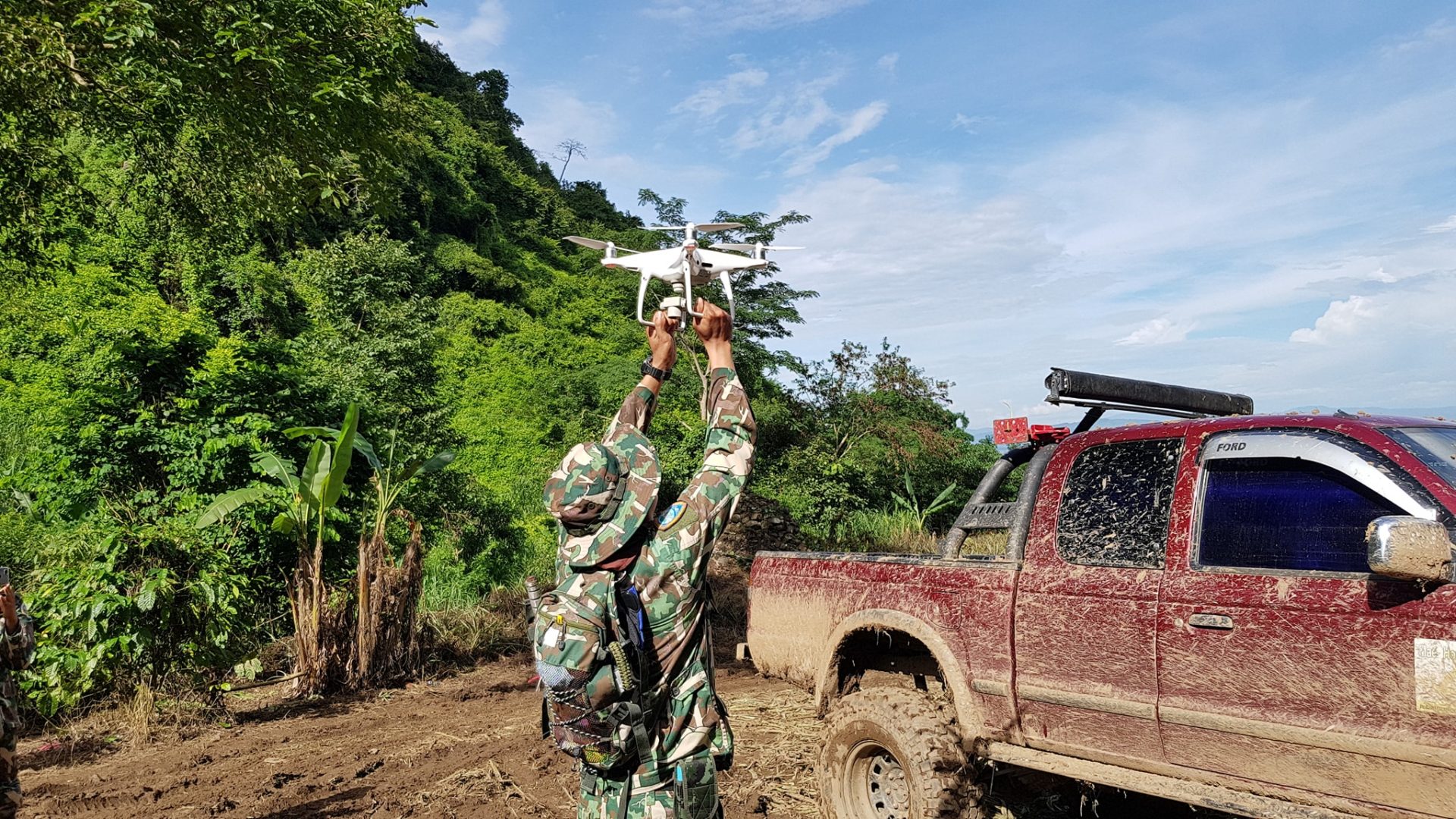 “แต่ข้อจำกัดคือ โดรนทุกลำถูกล็อคความสูงไว้ที่ 500 เมตร หมดทุกลำครับ เป็นไปตามกฎการบิน และสถานที่ที่เราบินเป็นภูเขาสูง 1100-1300 เมตร เราจึงต้องขึ้นไปบนดอยอีกลูก(ดอยผาหมี)ที่สูงกว่าหรือเท่ากันเพื่อบินข้ามมาปฏิบัติภารกิจครับ”