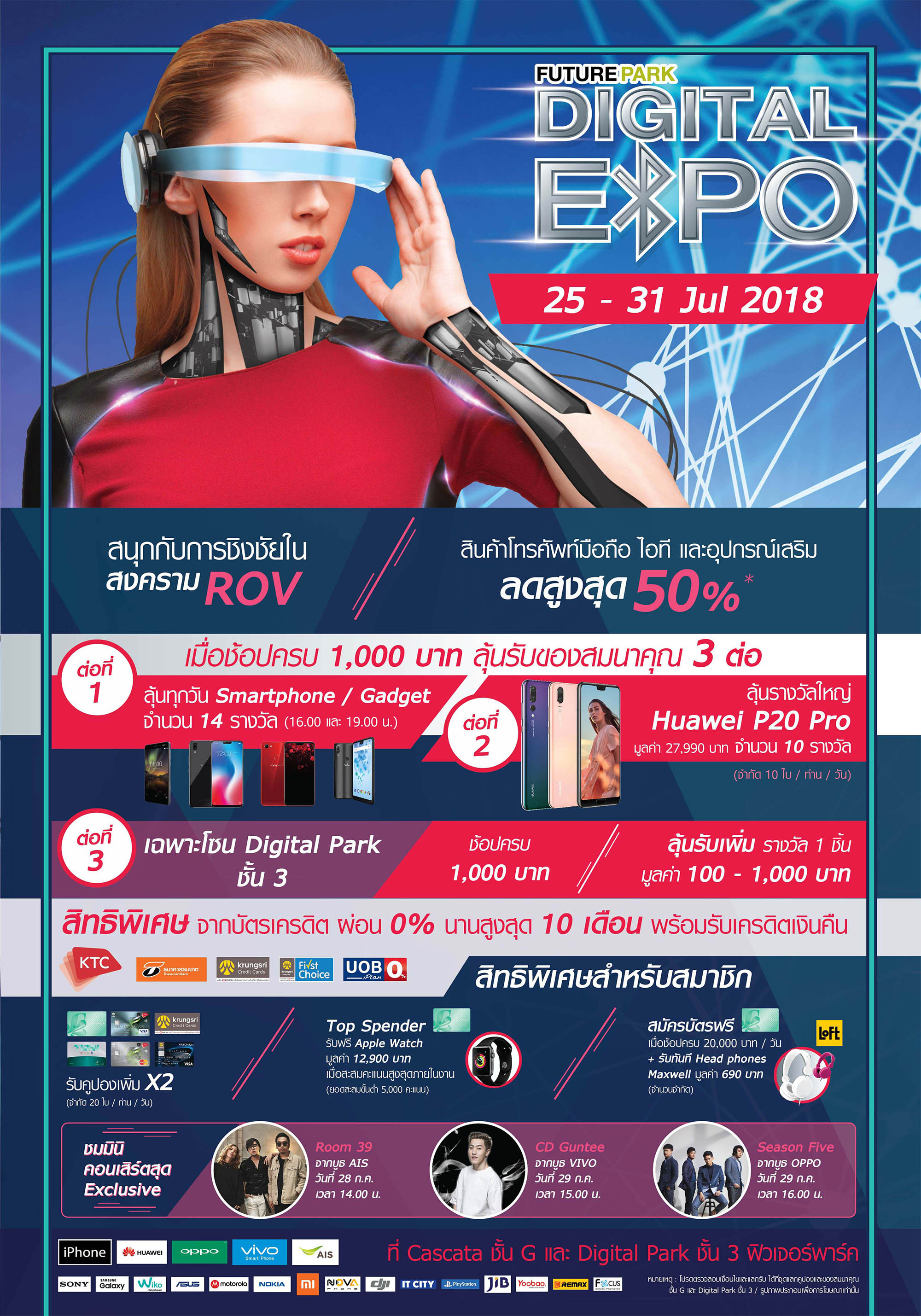 ใครกำลังเล็งจะซื้อโทรศัพท์มือถือ อุปกรณ์ไอทีและอุปกรณ์เสริม ลองแวะไปดูงาน Future Park Digital Expo 2018 กันไหมครับ จัดระหว่างวันที่ 25– 31 กรกฎาคม ณ บริเวณ แคสคาต้า ชั้น G ศูนย์การค้าฟิวเจอร์ พาร์ค รังสิต รวบรวมสินค้าดิจิตอลมากมาย มีแบรนด์อย่าง Sony, Samsung, OPPO, Asus, Huawei, Lenovo, AIS, True รวมแล้วมากกว่า 20 แบรนด์ดัง มาให้ช้อปกันพร้อมข้อเสนอลดสูงสุด 50 % และลุ้นรับของรางวัลมากมาย เมื่อซื้อสินค้าครบทุก 1,000 บาท