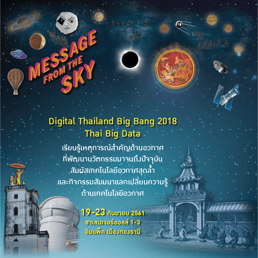 ใครที่ชอบเรื่องอวกาศ ระหว่างวันที่ 19 ถึง 23 กันยายนนี้เรามีนิทรรศการดีๆ “Message From The Sky” ซึ่งเป็นส่วนหนึ่งของงาน Digital Thailand Big Bang 2018 ที่ชาเลนเจอร์ฮอลล์ 1-3 อิมแพ็ค เมืองทองธานีครับ