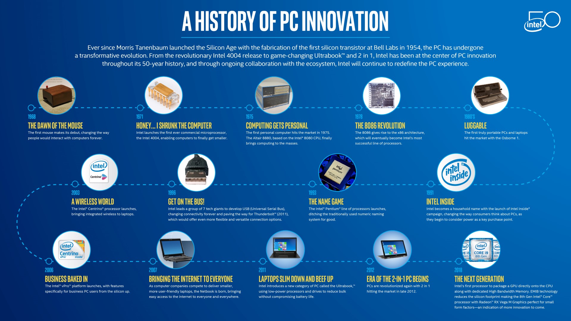 Intel นั้นอยู่กับเรามายาวนานมากนะครับ ตัวบริษัท Intel นั้นก่อตั้งตั้งแต่ปี 1968 นับถึงปีนี้ก็ 50 ปีพอดี ซึ่งครึ่งศตวรรษที่ผ่านมา อินเทลก็พัฒนาเทคโนโลยีที่เราใช้กันอยู๋ในชีวิตประจำวันหลายอย่าง เช่นซีพียูสถาปัตยกรรม x86 ที่เป็นมาตรฐานของหน่วยประมวลผลในคอมพิวเตอร์มาถึงปัจจุบัน, มาตรฐาน USB พอร์ตเชื่อมต่อที่ได้รับความนิยมสูงสุด หรือรูปแบบคอมพิวเตอร์ที่นิยมในปัจจุบันอย่าง Ultrabook หรือ 2-in-1 Notebook