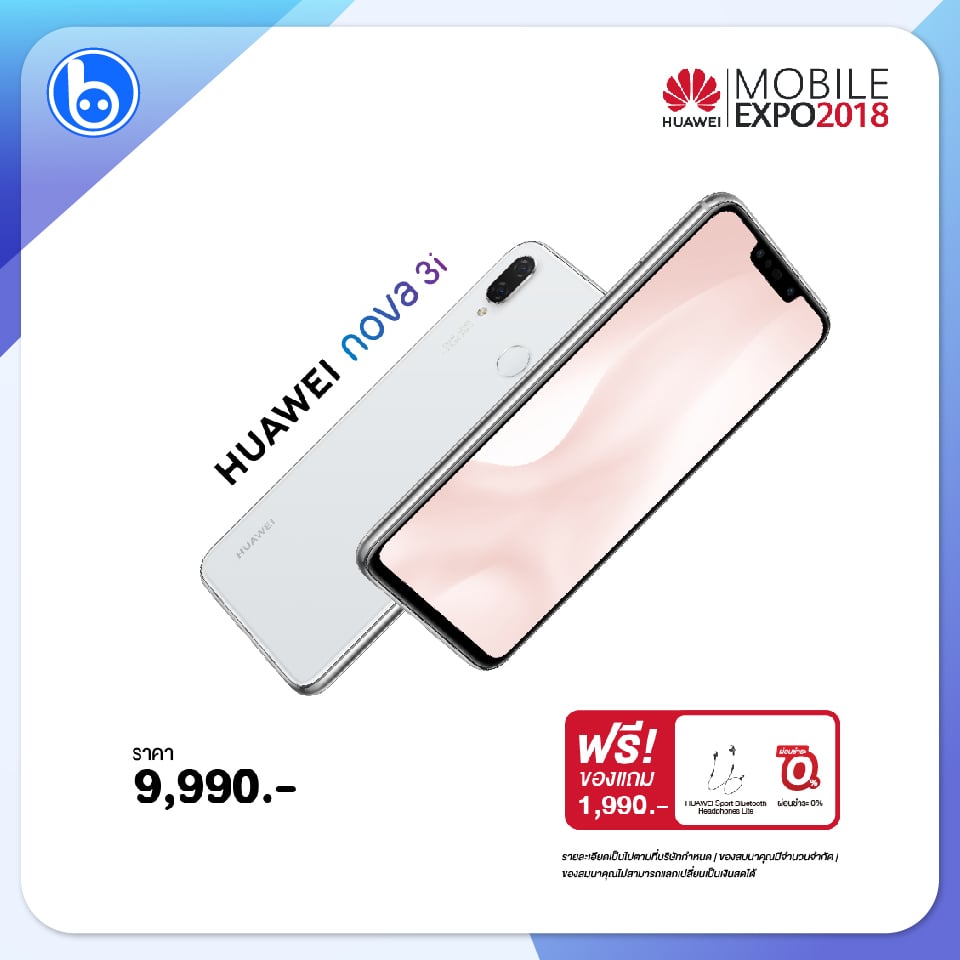 และ Huawei nova 3i ซื้อในช่วงนี้ในราคา 9,990 บาท รับฟรี HUAWEI Sport Bluetooth Headphones Lite มูลค่า 1,990 บาทไปด้วยเลย
