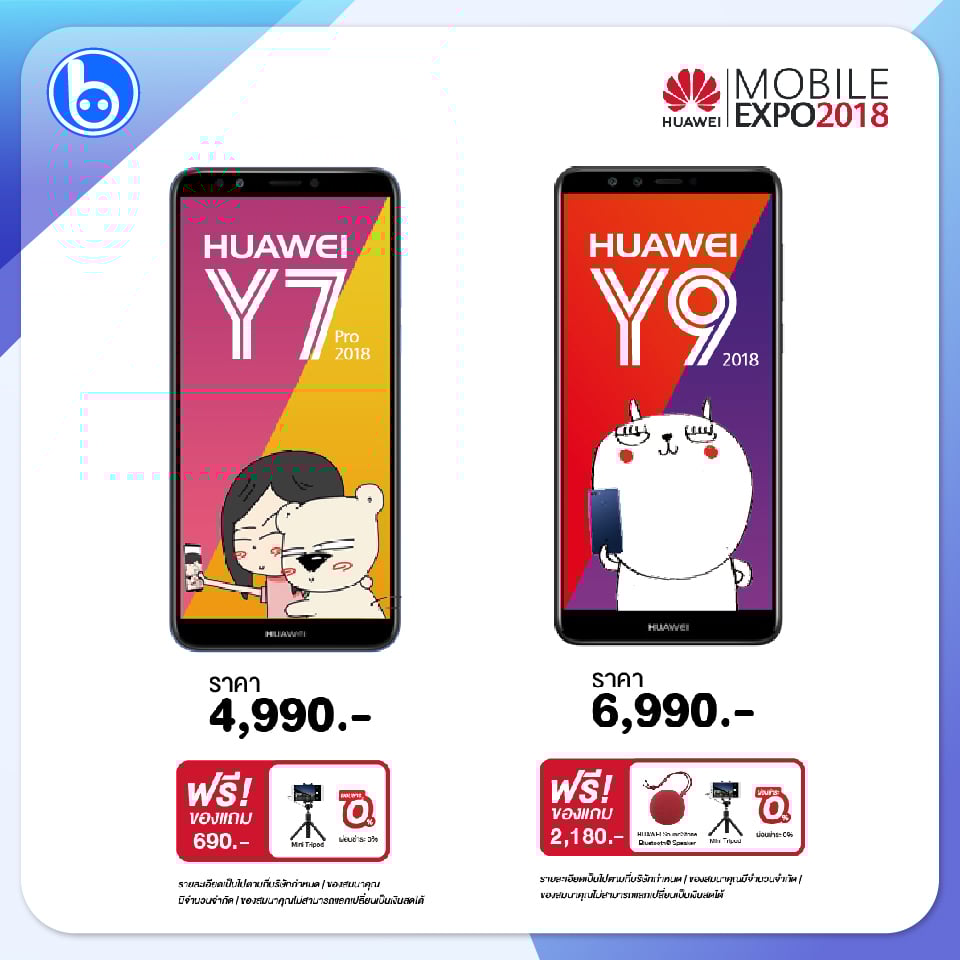 ส่วนซีรีส์น้องเล็ก ก็จัดมาให้ทั้งจอใหญ่เต็มตา แชะสวย แต่ราคาเบาๆ ภายในงานพิเศษมากขึ้นเมื่อซื้อ HUAWEI Y9 2018 ในราคา 6,990 บาท รับฟรี HUAWEI SoundStone Bluetooth Speaker และ Mini Tripod มูลค่ารวม 2,180 บาท หรือซื้อ HUAWEI Y7 Pro 2018 ในราคา 4,990 บาท รับฟรี Mini Tripod มูลค่า 690 บาท