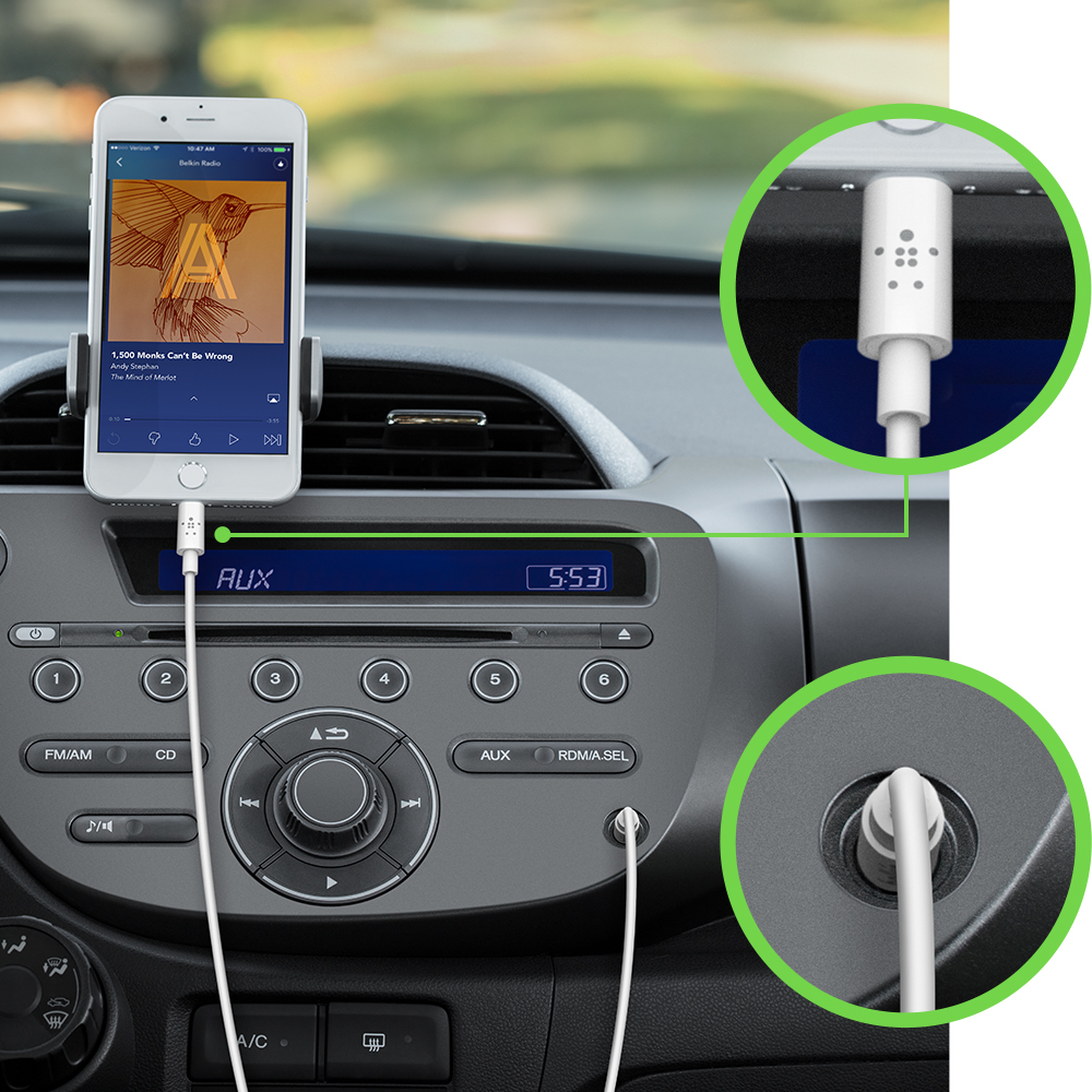 นอกจาก Lightning Audio + Charge RockStar™ และ 3.5 mm Audio + Charge RockStar™ ที่สามารถต่อกับไอโฟนพร้อมชาร์จและฟังเพลง/รับสายพร้อมกันได้ ยังมีสายต่อเครื่องเสียงจากเบลคิน รุ่น 3.5 mm Audio Cable With Lightning Connector ช่วยให้ผู้ใช้สามารถเชื่อมต่อไอโฟนเพื่อฟังเพลงโปรดจากเครื่องเสียงขนาดใหญ่ได้อย่างง่ายดายให้คุณเพลิดเพลินกับเสียงเพลงได้ทุกที่ทุกเวลา ซึ่ง