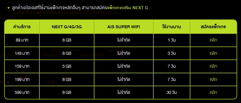- หรือถ้าใช้แพ็กเกจอื่นๆ ก็สมัครแพ็กเสริม NEXT G ในราคาเริ่มต้น 89 บาท