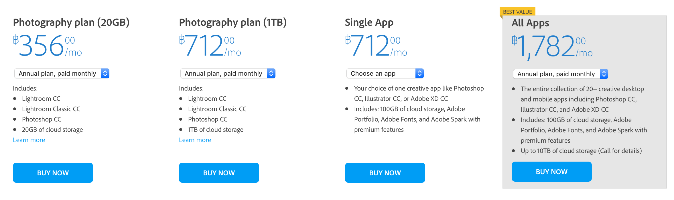 จากข้อมูลที่เราได้มาตอนนี้ แพ็กเกจเต็ม ใช้ได้ทุกโปรแกรมของ Adobe Creative Cloud ราคา 1,782 บาทต่อเดือน จะขึ้นราคาเป็น 1,888 บาทต่อเดือนในวันที่ 12 กุมภาพันธ์ 2019 ที่จะถึงนี้ ส่วนราคาของแพ็กเกจอื่นๆ อย่าง Photography Plan ที่เริ่มต้น 356 บาทต่อเดือน จะกลายเป็นเท่าไหร่เราก็ยังไม่รู้เหมือนกัน (เพราะเราสมัครสมาชิกแบบเต็มเอาไว้ใช้ในบริษัท ทำให้เรารู้แต่ราคาชุดเต็ม) แต่ถ้าขึ้น 6% เท่ากัน มันก็จะกลายเป็น 378 บาทต่อเดือน