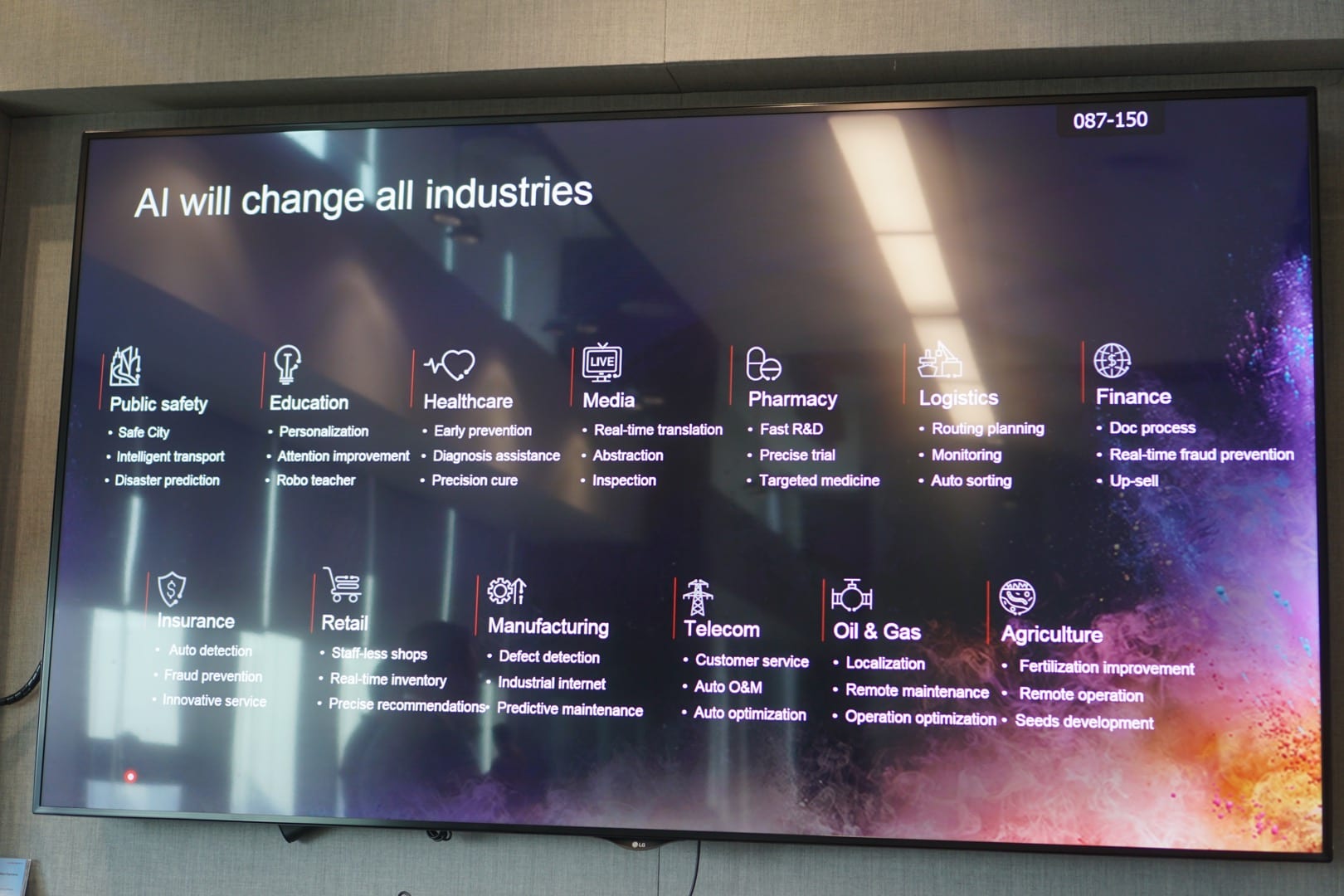 • แคมปัส+AI: หุ่นยนต์จะทำหน้าที่ตรวจตราดูแลภายในบริเวณพื้นที่ขนาดใหญ่และประมวลผลเพื่ออนุญาตการเข้าพื้นที่ภายในเวลาเสี้ยววินาทีโดยใช้อัลกอริธึ่มระบบการจดจำที่แม่นยำ นอกจากนี้ ยังสามารถปรับปรุงการแสดงผลโฆษณาได้แบบเรียลไทม์ด้วยระบบจดจำใบหน้า และการวิเคราะห์เพื่อปรับปรุงความแม่นยำในด้านการตลาดที่ดีขึ้น