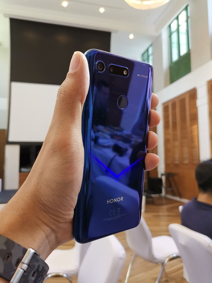 Honor View 20 นั้น โดดเด่นตั้งแต่ดีไซน์ของตัวเครื่องอันไร้รอยบาก (แต่มีรู) ที่เรียกว่า All-View Display ขนาด 6.4 นิ้วที่มีพื้นที่หน้าจอถึง 91.8% และกล้องหน้าความชัดระดับ 25 ล้านพิกเซลที่ฝังในหน้าจอตามกระแสนิยมแถม Honor ยังได้นำเทคโนโลยีนาโนลิโทกราฟีมาใช้ในการพัฒนาการดีไซน์พื้นผิวบนตัวเครื่องเพื่อสร้างพื้นผิวนาโนที่มองไม่เห็นบนฝาหลัง ตลอดจนการใช้นวัตกรรมการเคลือบพื้นผิวแบบ Nano-Vacuum เจนเนอเรชั่นที่ 4 ประกอบกับการใช้กระบวนการ Invisible Aurora Texture มาทำให้เกิดการไล่ระดับสีที่ฝาหลังในรูปแบบ V-shape ทำให้ด้านหลังของตัวเครื่องมีสีสันที่สดใสและเปล่งประกายอย่างงดงาม น่าสัมผัสในทุกมุมมอง โดยจะเข้าเข้าไทยทั้งสิ้นสองสีคือ Midnight และ Black Sapphire Blue