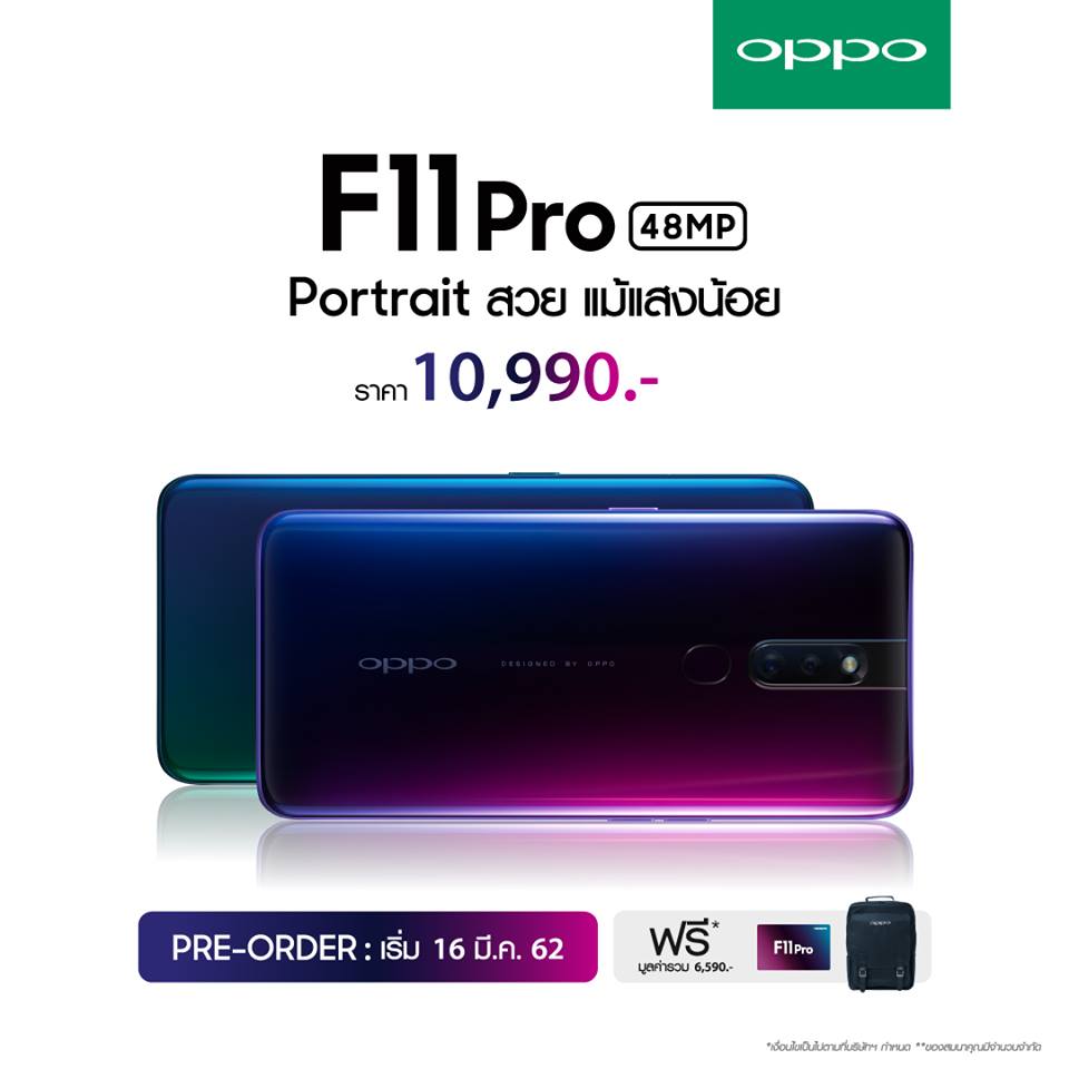 OPPO F11 Pro ราคา 10,990 บาท จอง 16-27 มีนาคม รับ VIP Card ประกันจอแตก พร้อมกระเป๋าเป้ ขายรอบพิเศษ 15 มีนาคมใน lazada แถม VIP Card, OPPO Smart Bag พร้อมตั๋วเครื่องบินในประเทศด้วย ซึ่งถ้าสั่งจองรอบนี้ทัน เครื่องจะจัดส่งในวันรุ่งขึ้นเลย