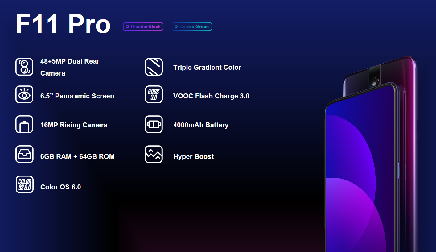 OPPO F11 Pro มีให้เลือก 2 สีคือ thunder black สีดำแบบไล่เฉดสี ดำ ม่วง น้ำเงิน และสี aurora green ไล่สีเหมือนแสงเหนือ จากเขียวไปหาน้ำเงิน โดยสแกนลายนิ้วมืออยู่ด้านหลัง