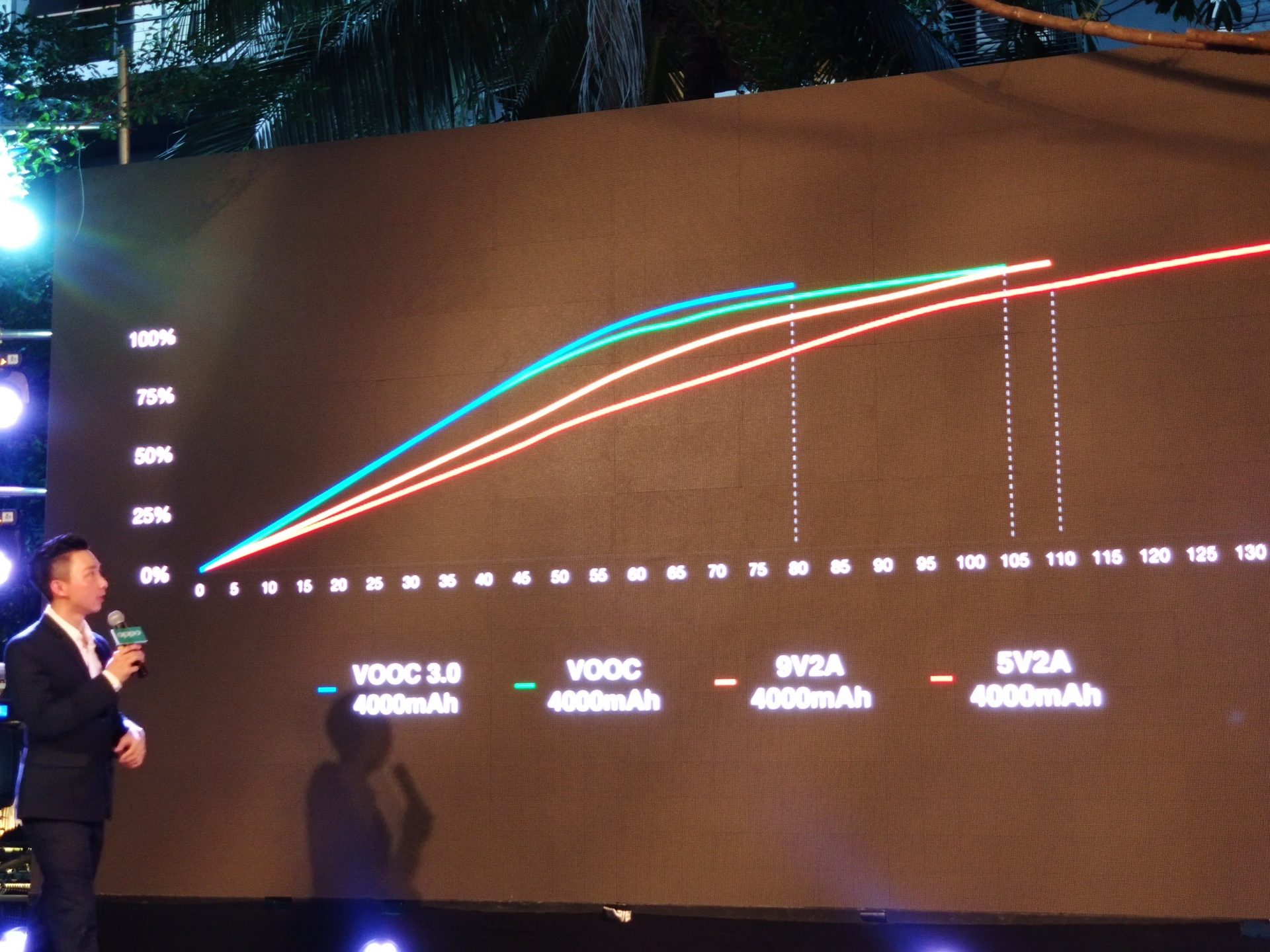 และการชาร์จก็ใช้ระบบใหม่ที่เรียกว่า VOOC Charge 3.0 ชาร์จ 5 นาที คุยได้ 2 ชั่วโมง และชาร์จ 80 นาที แบต 4000 mAh ก็เต็ม เร็วกว่า VOOC เดิม 20%