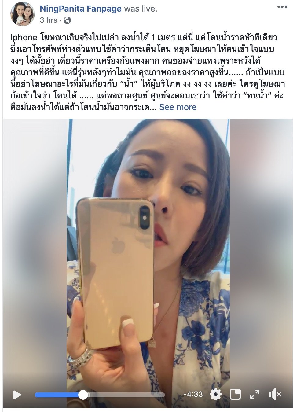 ต้องเรียกว่าสงกรานต์เป็นเทศกาลปราบเซียนของสมาร์ตโฟนทุกแบรนด์ หลังจาก Huawei P30 Pro โดนดราม่าหนักมากก่อนหน้านี้ ว่าได้ IP68 จริงหรือไม่ ทำไมโดนน้ำแล้วฝ้าขึ้นเลนส์ได้ วันนี้ iPhone (เข้าใจว่าเป็นรุ่น XS) ของดาราสาว หนิง-ปณิตาก็เสียหายเพราะน้ำกระเซ็นใส่ ซึ่งแน่นอนว่าถ้าเจอความซื้นในเครื่องก็ไม่สามารถเรียกร้องสิทธิ์ประกันได้ ทำให้ดาราสาวต้องเสียค่าเปลี่ยนเครื่องเต็มอัตราถึง 21,300 บาท!