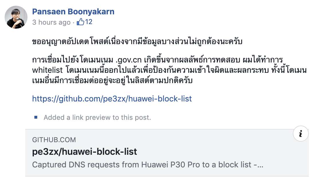 กลายเป็นข่าวกระจายไปทั่วโลกโซเซียลเน็ตเวิร์คไทยหลัง Pansaen Boonyakarn นักวิจัยด้านความปลอดภัยของไทยตั้งข้อสังเกตว่าการเชื่อมต่ออินเทอร์เน็ตของ Huawei P30 Pro มีการติดต่อไปที่ beian.gov.cn ซึ่งเป็นเซิร์ฟเวอร์ของรัฐบาลจีนด้วย โดย beian.gov.cn มีหน้าที่ให้ใบอนุญาตให้บริการเว็บไซต์ในจีน แต่หลังจากทดสอบเพิ่มเติมจึงสรุปผลว่าเป็นข้อผิดพลาดในการทดสอบ