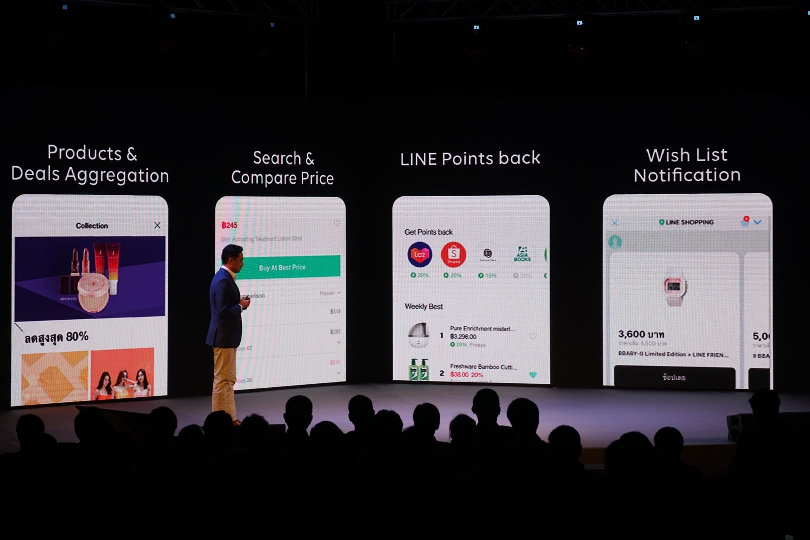 งานนี้ LINE จับมือกับ Lazada, Shopee และ Marketplace อีกหลายราย เพื่อรวมผลิตภัณฑ์มาไว้ใน LINE shopping ลูกค้าสามารถค้นหาสินค้าเทียบราคาจากหน้าร้านต่างๆ ได้เลย (แต่ไม่มีรายละเอียดว่าเราจะเทียบราคาหลังใส่ส่วนลด คูปองต่างๆ ได้ยังไง) แถมยังเก็บคะแนนเมื่อซื้อของผ่าน LINE Points back เพื่อเอาไปซื้อสติกเกอร์และธีมได้ พร้อมการแจ้งเตือน Wish List เมื่อราคาลดลงได้