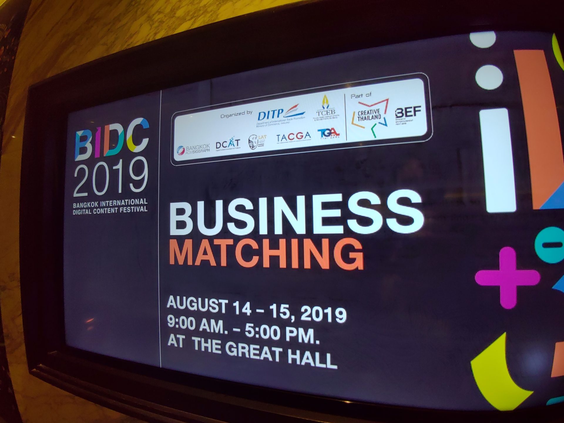 “ภายในงานยังได้จัดกิจกรรมเจรจาการค้าระหว่างผู้ประกอบการด้านดิจิทัลคอนเทนต์ของไทยและต่างชาติเข้าร่วมกว่า 39 บริษัทจาก 12 ประเทศ ได้แก่ ญี่ปุ่น เกาหลี จีน สิงคโปร์ อินเดีย อินโดนีเซีย ไต้หวัน ฟินแลนด์ โปแลนด์ สเปน ฮ่องกงและมาเลเซีย ที่จะเข้าร่วมเจรจาการค้า หรือ Business Matching อาทิเช่น บริษัท วอลต์ดีสนีย์ (Walt Disney Company) ผู้ผลิตภายนตร์และแอนิเมชันระดับโลก, CCTV Animation เป็นสถานีโทรทัศน์รายใหญ่ที่มีผู้รับชมมากที่สุดในจีน , Bandai Namco Studios และ Grasshopper Manufacturing ทีมพัฒนาเกม LET IT DIE เป็นต้น และมีผู้ประกอบการไทย 67 ราย อาทิ บริษัท กันตนา แอนิเมชัน สตูดิโอ จำกัด