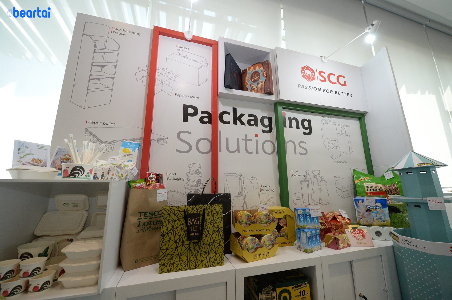 - โซลูชันบรรจุภัณฑ์ของ SCG ที่ถูกออกแบบมาอย่างหลากหลายเพื่อตอบโจทย์ทุกความต้องการของลูกค้า ไม่ว่าจะเป็นบรรจุภัณฑ์อาหารปลอดภัยที่ย่อยสลายได้ บรรจุภัณฑ์พลาสติกที่นำไปรีไซเคิลได้ง่าย บรรจุภัณฑ์จากกระดาษรีไซเคิล ชั้นวางสินค้ากระดาษเพื่อการจัดแสดง (Merchandising Display) เป็นต้น