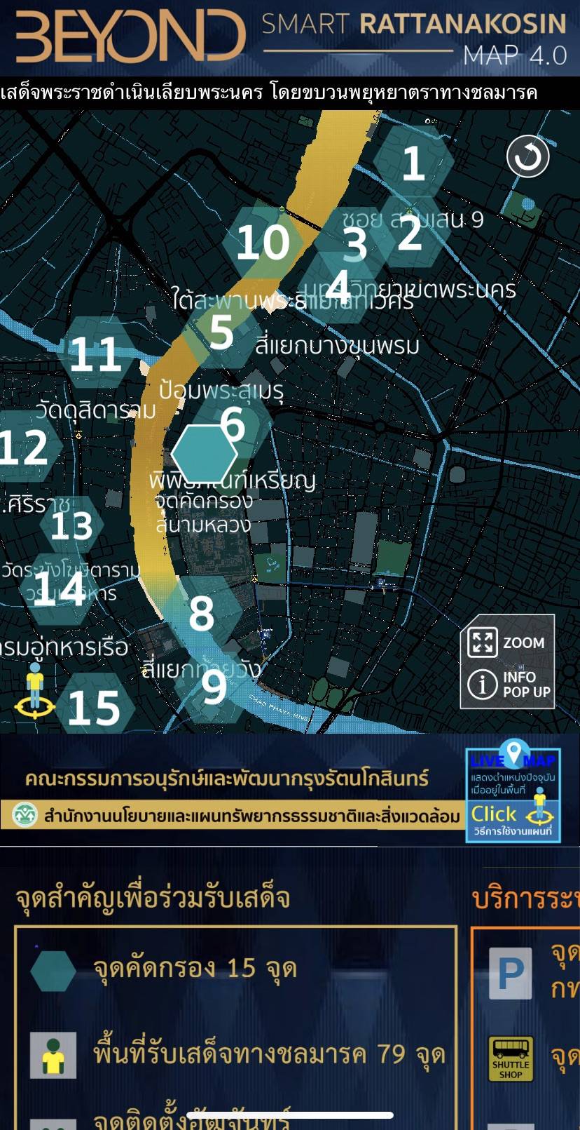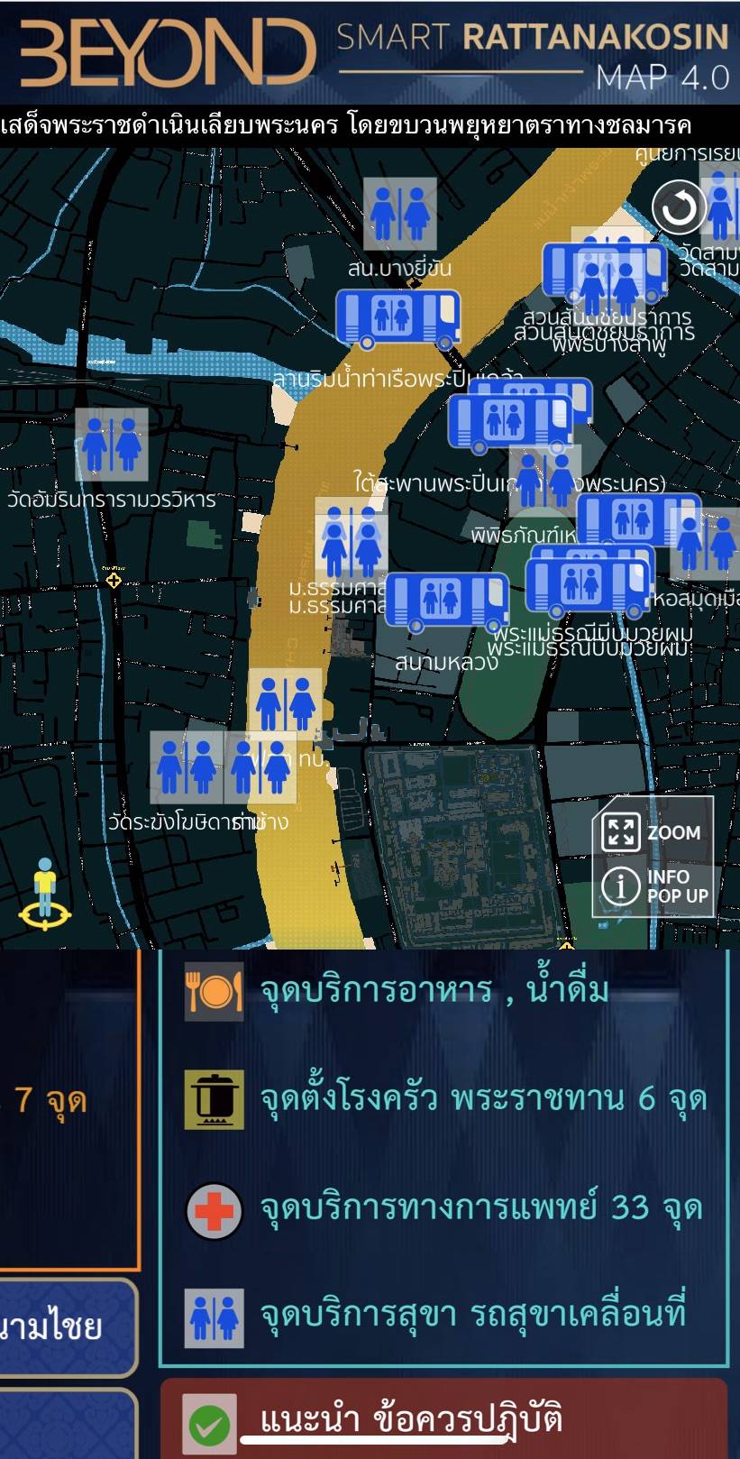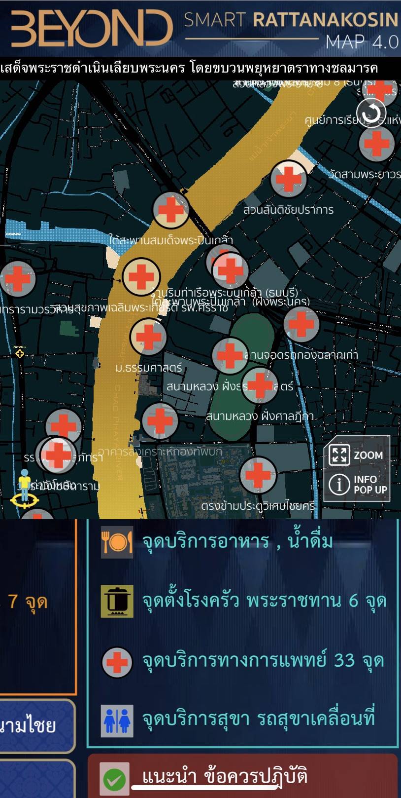 ซึ่งเมื่อเข้าเว็บ แผนที่กรุงรัตนโกสินทร์ 4.0 จะเห็นแผนที่อยู่ด้านบน และตัวเลือกแสดงข้อมูลต่างๆ อยู่ในหน้าจอด้านล่างครับ ซึ่งสามารถกดข้อมูลที่สนใจให้แสดงจากด้านล่างเพื่อแสดงตำแหน่งในแผนที่ได้เลย ใครที่เตรียมตัวไปพระราชพิธีครั้งนี้ อย่าลืมทำ Bookmark หรือทำเป็นไอคอนไว้ที่หน้าโฮมนะครับ ถึงหน้างานจริง ๆ จะได้ไม่สับสน