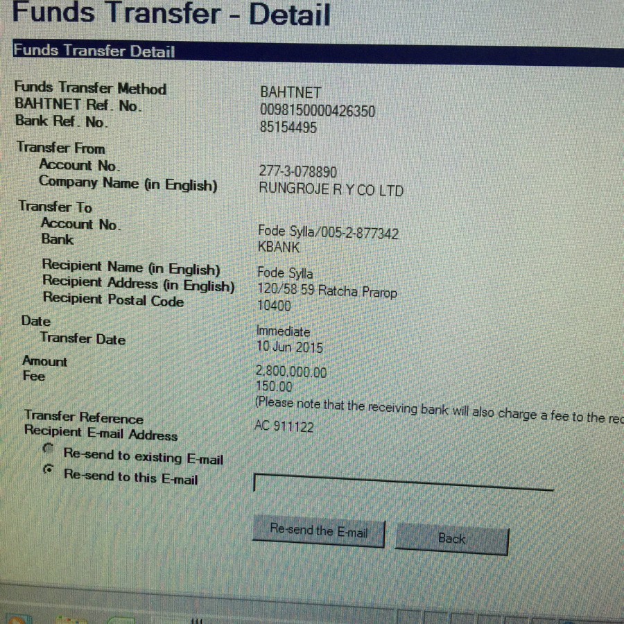 ข้อมูลจากฝั่งคุณ FilmTepGano ระบุว่ามีการโอนเงิน 2 ครั้งในวันที่ 10/6/58 ไปที่ธนาคารกสิกรไทยจำนวน 2.8 ล้านบาท และ 26/6/58 ไปที่ธนาคารกรุงเทพจำนวน 2.75 ล้านบาท รวมมูลค่าความเสียหายเป็นเงินกว่า 5.55 ล้านบาท โดยเจ้าของกระทู้บอกว่าที่รู้ตัวช้าเพราะเป็นบัญชีของบริษัทที่มีเงินเข้าออกหลายรายการทุกๆ วัน จึงทำให้ล่วงเลยมาหลายวันจึงจะรู้ตัว