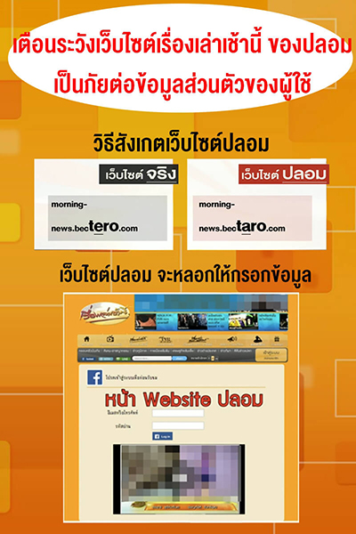 ในยุคที่ข้อมูลข่าวสารถูกแชร์กันผ่าน Social Network เป็นหลัก ทำให้มีการพยายามปลอมตัวเป็นคนดัง เพจดังกันมากมาย อย่างกรณีล่าสุดที่เกิดกับเรื่องเล่าเช้านี้ก็ใช้ข่าวฉาวเข้ามาหลอกล่อให้คนคลิกเข้าไปอ่าน โดยทำภาพให้เหมือนมาจากรายการข่าวดัง ซึ่งก็ได้ผล มีทั้งคนไลค์คนแชร์มากมาย ซึ่งถ้าสังเกตชื่อเพจจะเห็นว่าเขียนให้คล้ายกันเป็น “เรื่องเเล่าเช้านี้” และชื่อลิงค์ที่เขียนอยู่ใต้ข่าวไม่ใช่เว็บหลัก morning-news.bectero.com