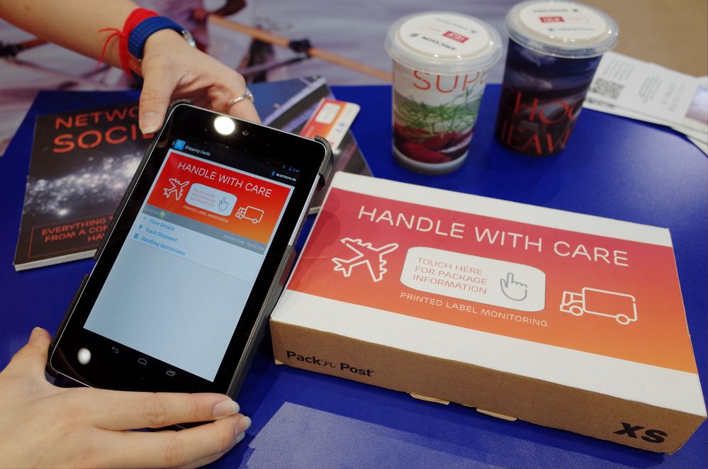 ไฮไลท์สำคัญของบูธนี้คือ Connected paper ที่ถ้ามางานนี้อย่าลืมมาดูให้ได้นะครับ เจ๋งจริง ซึ่งเทคโนโลยีนี้จะเปลี่ยนร่างกายมนุษย์เป็นสื่อกลางระหว่างสมาร์ทโฟนหรือแท็บเล็ต กับอุปกรณ์ สินค้า วิธีใช้ก็ง่ายๆ แค่จับอุปกรณ์ที่ติดตั้ง Connected Paper เจ้า Smart device ที่เราถืออยู่ก็จะบอกได้ทันทีว่าของชิ้นนั้นคืออะไร บอกข้อมูลรายละเอียดเช่นวันที่ผลิตได้ด้วย ซึ่งก็คล้ายๆ กับ RFID หรือ NFC แต่ใช้ร่างกายมนุษย์เป็นสื่อเลย